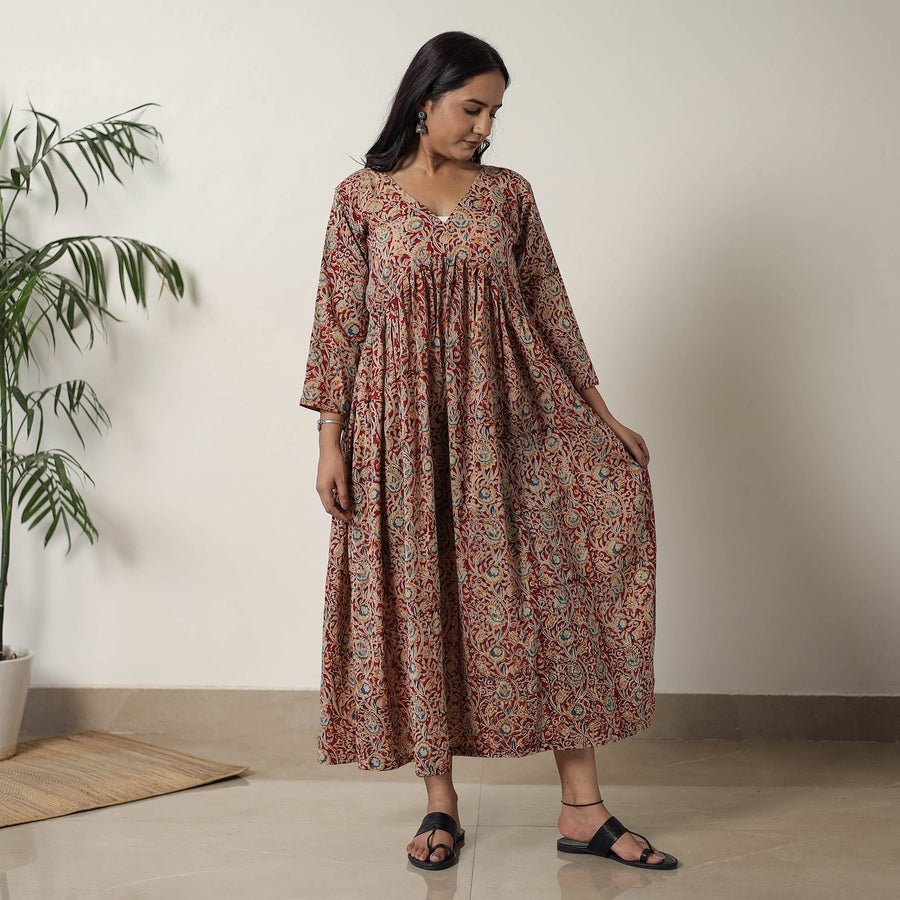 Indulge in the traditional charm of this pedana kalamkari block-printed cotton flared dress, thoughtfully designed to enhance your style. This dress is crafted from cotton fabric, ensuring a comfortable feel against your skin. This cotton dress makes you comfortable all day long.
