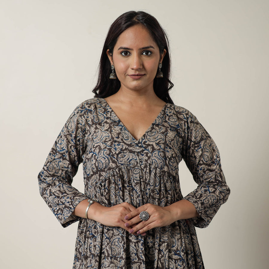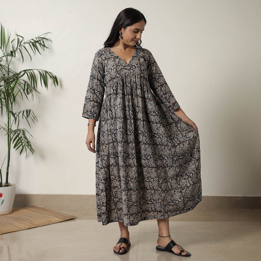 Indulge in the traditional charm of this pedana kalamkari block-printed cotton flared dress, thoughtfully designed to enhance your style. This dress is crafted from cotton fabric, ensuring a comfortable feel against your skin. This cotton dress makes you comfortable all day long.