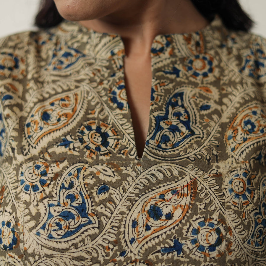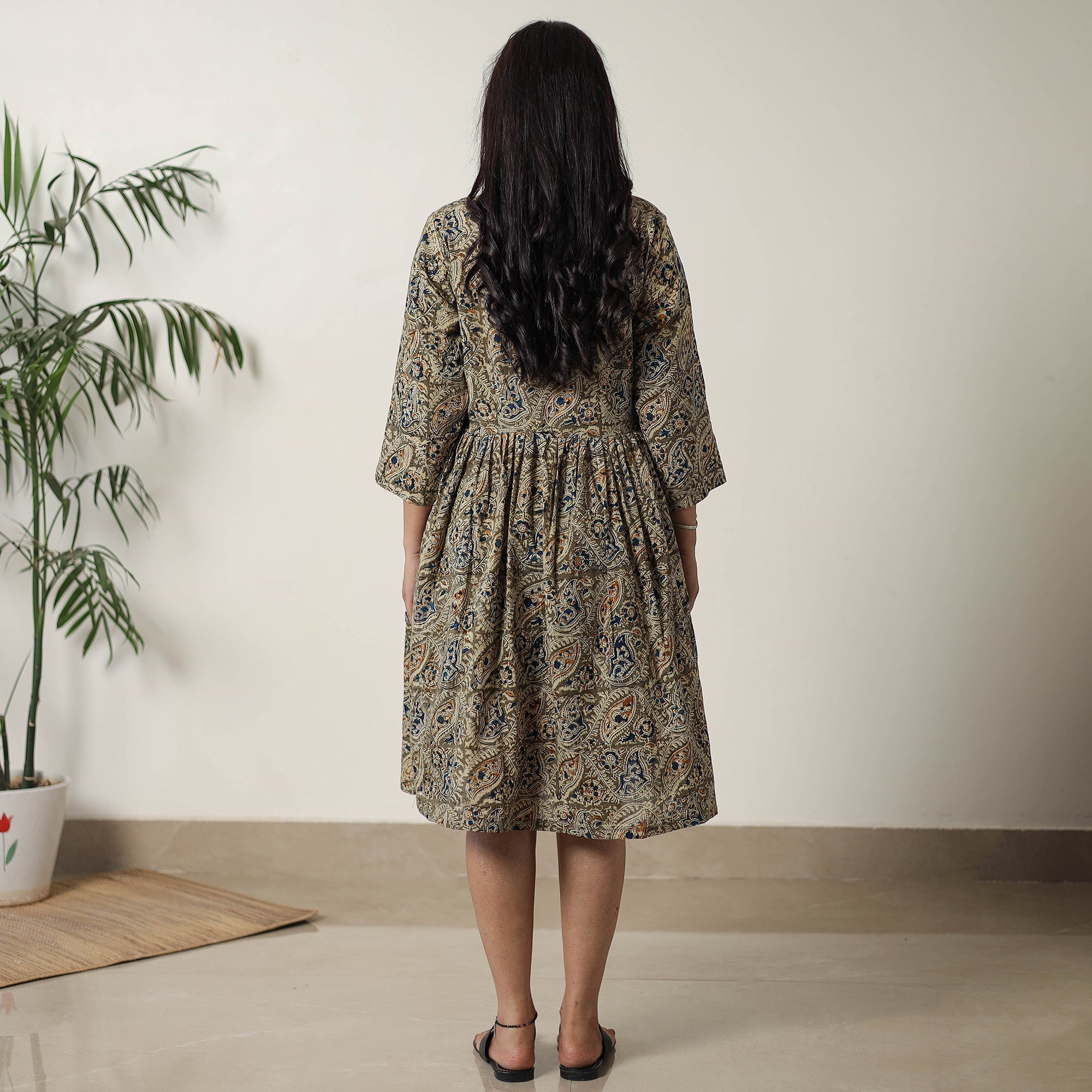 Indulge in the traditional charm of this pedana kalamkari block-printed cotton flared dress, thoughtfully designed to enhance your style. This dress is crafted from cotton fabric, ensuring a comfortable feel against your skin. This cotton dress makes you comfortable all day long.