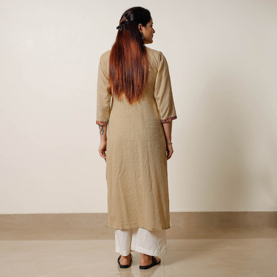 The running stitch cotton straight kurta with kalamkari patchwork. This is made from prewashed running stitch cotton fabric. features the addition of one side pocket, enhancing its functionality. Perfect for your daily outing and for a special occasion.