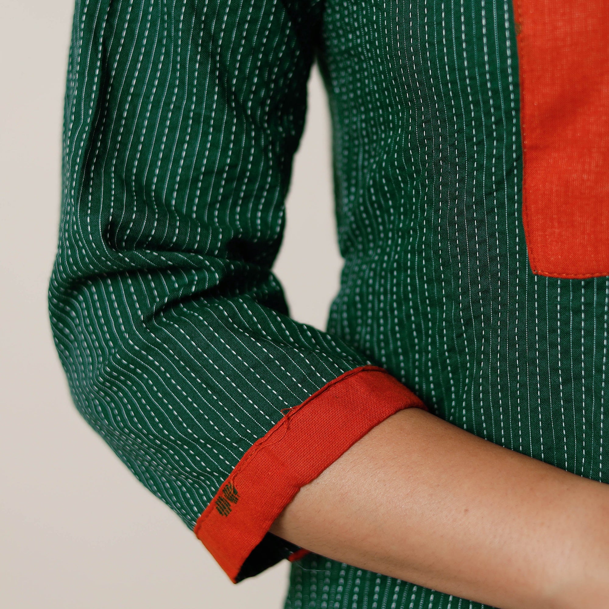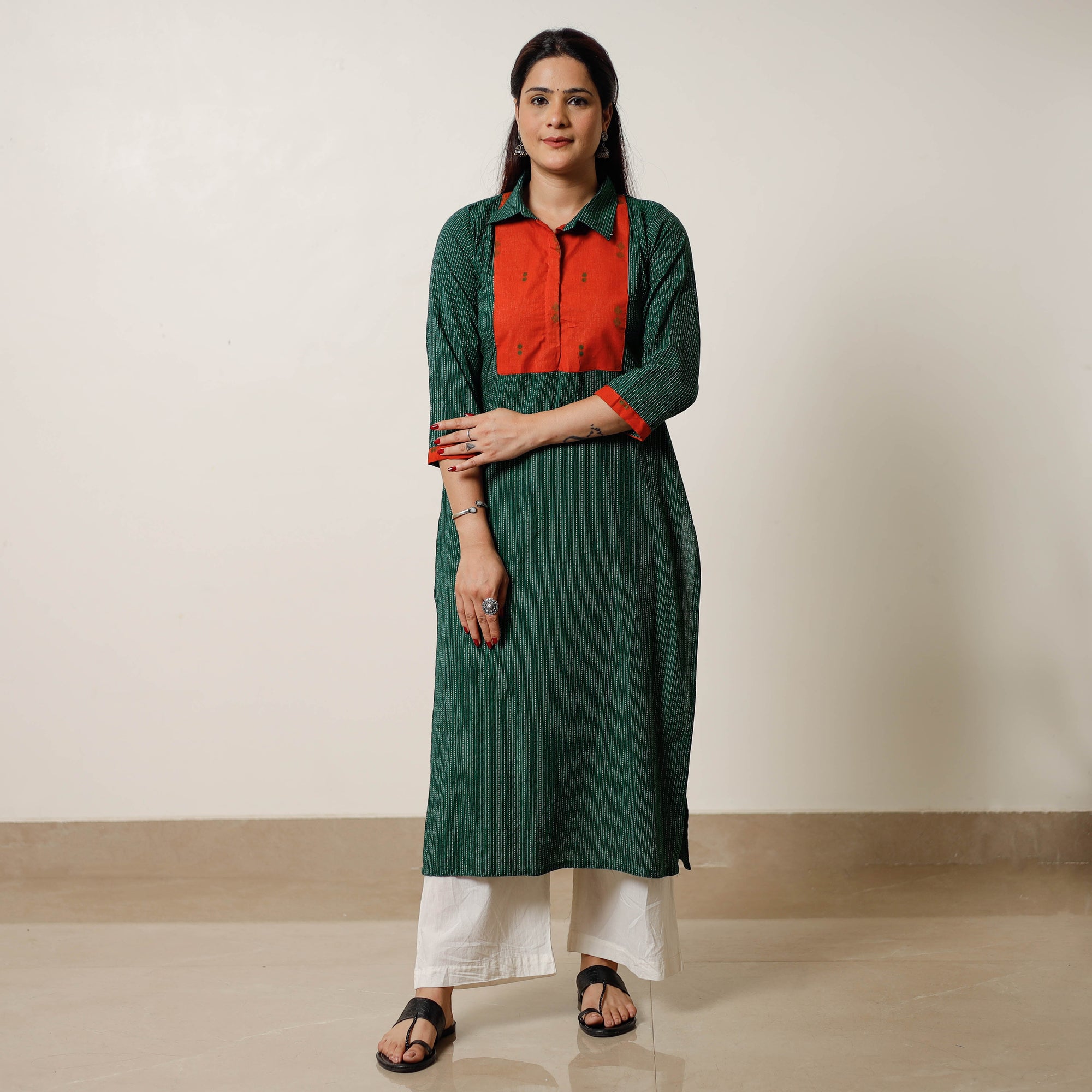 The running stitch cotton straight kurta with jacquard patchwork. This is made from prewashed running stitch cotton fabric. features the addition of one side pocket, enhancing its functionality. Perfect for your daily outing and for a special occasion.