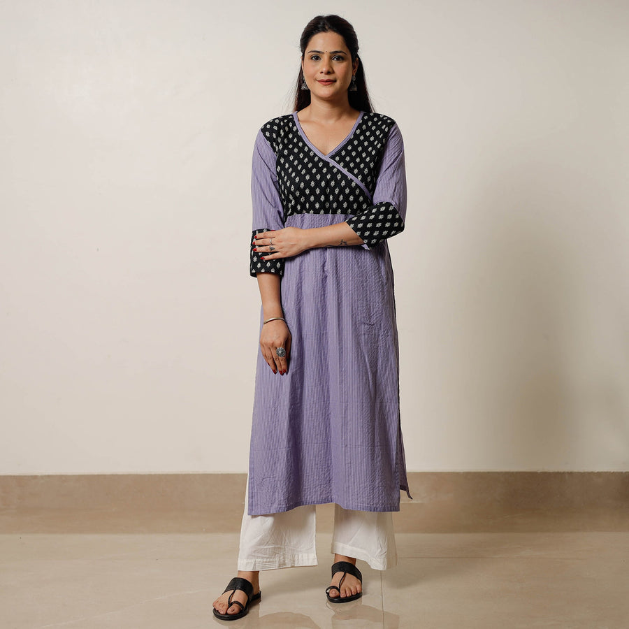 The running stitch cotton straight kurta with ajrakh patchwork. This is made from prewashed running stitch cotton fabric. features the addition of one side pocket, enhancing its functionality. Perfect for your daily outing and for a special occasion.