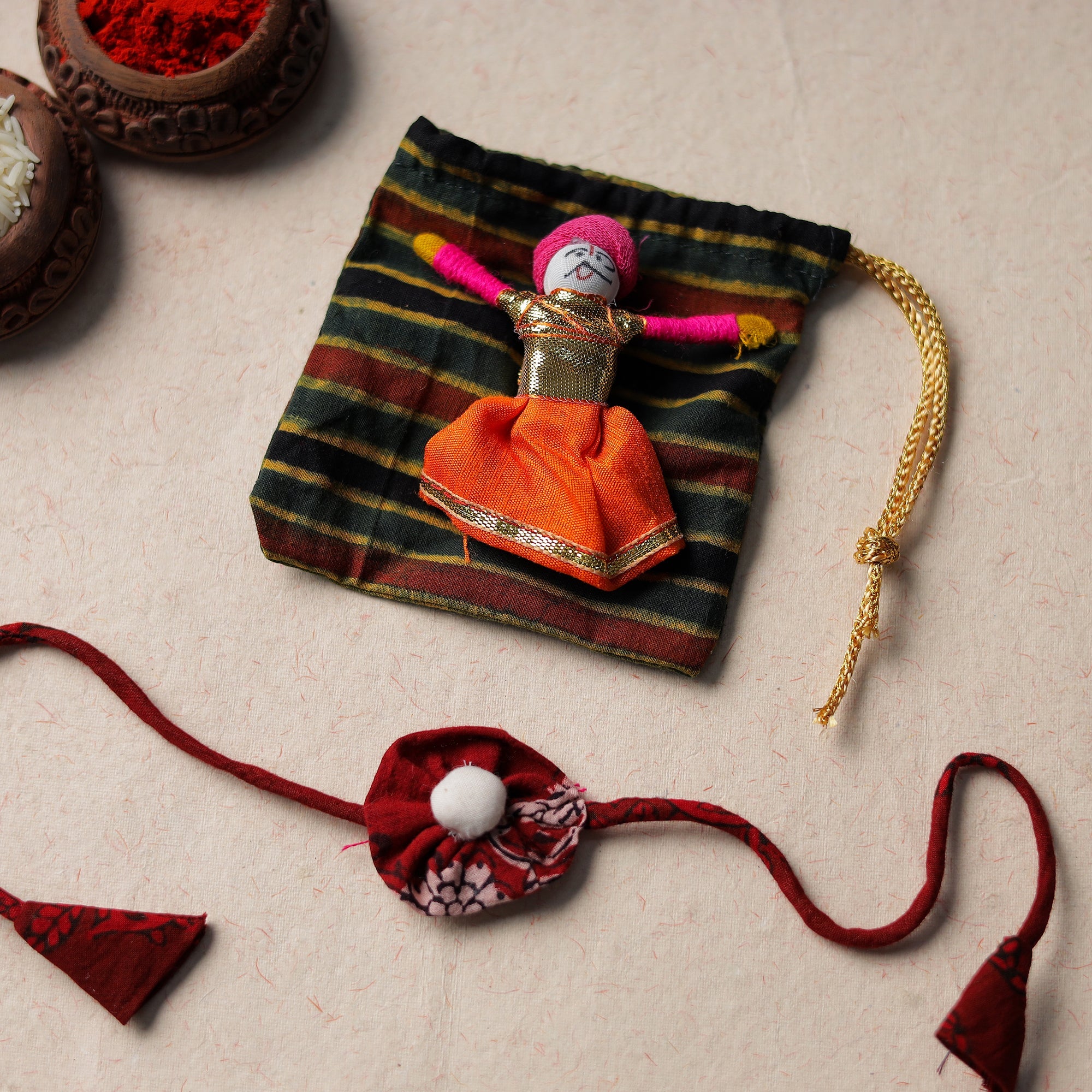 Our rakhi is naturally dyed by artisans and turned into handmade ribbons. It is also wrapped in environmentally friendly paper.