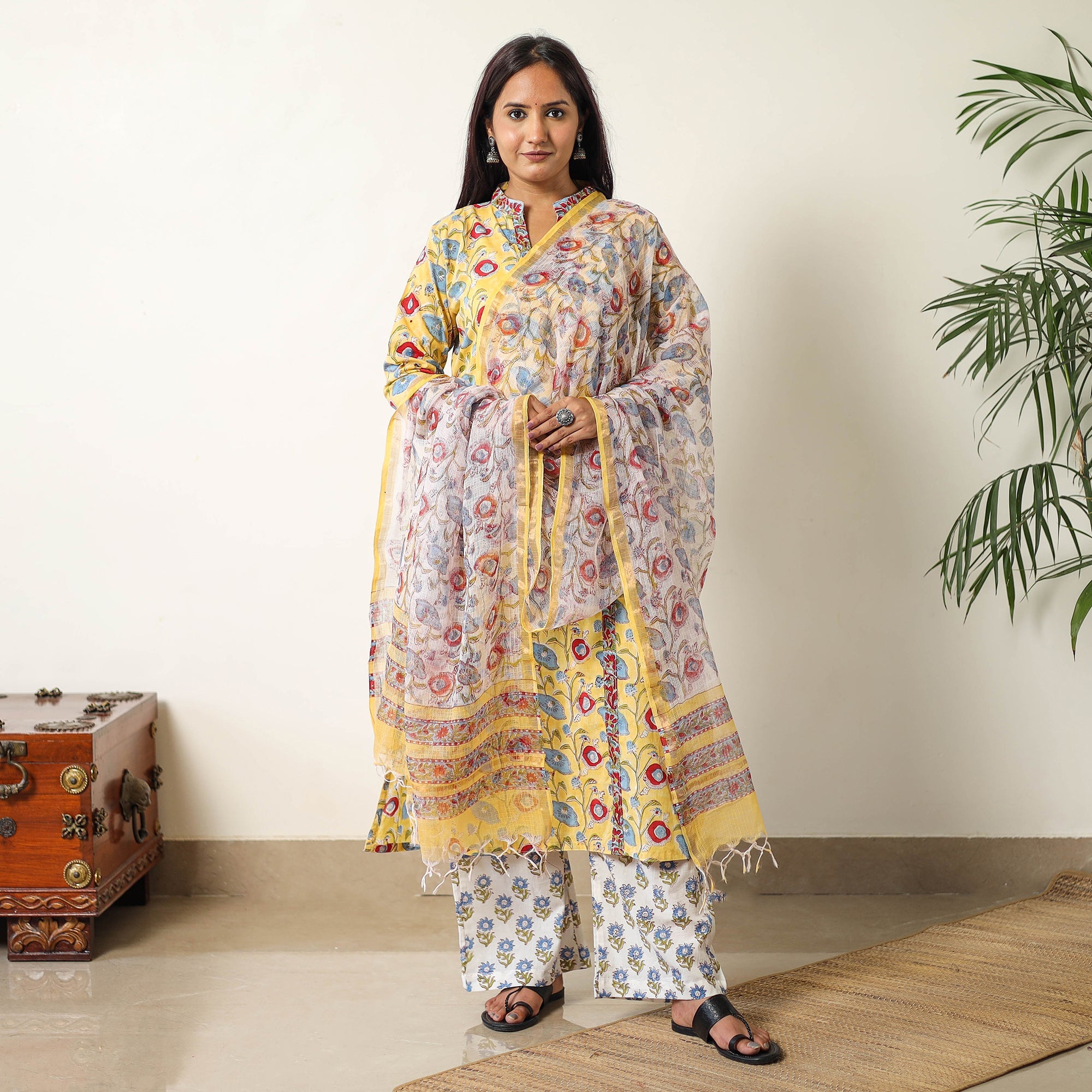 Look and feel beautiful in this uniquely designed sanganeri block-printed cotton kurta with palazzo & dupatta set. This suit set contains a cotton kurta, palazzo, and kota doria dupatta. The kurta has one side pocket, and the palazzo has two side pockets. This cotton suit makes you comfortable all day long. This suit is perfect for your daily outing and for a special occasion.