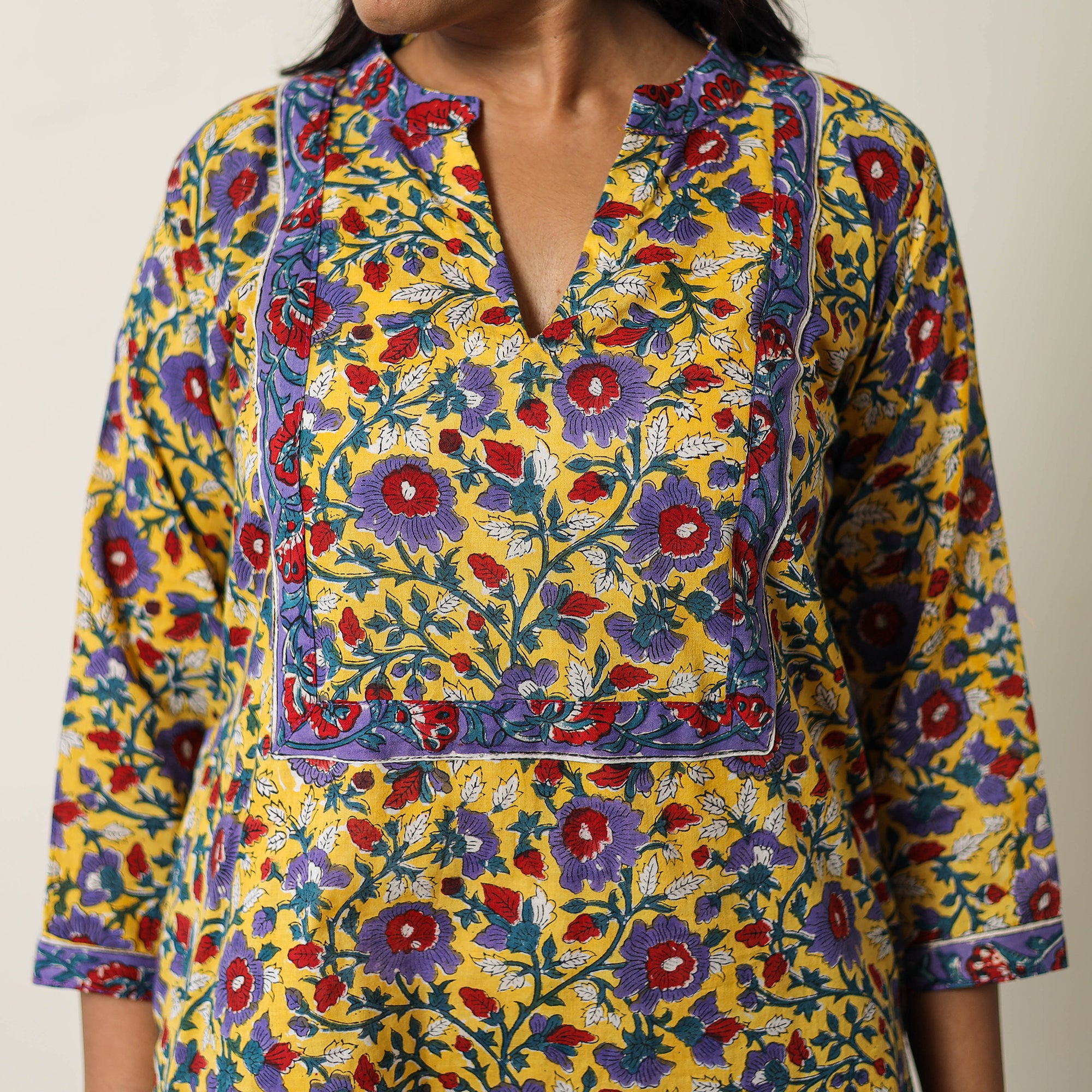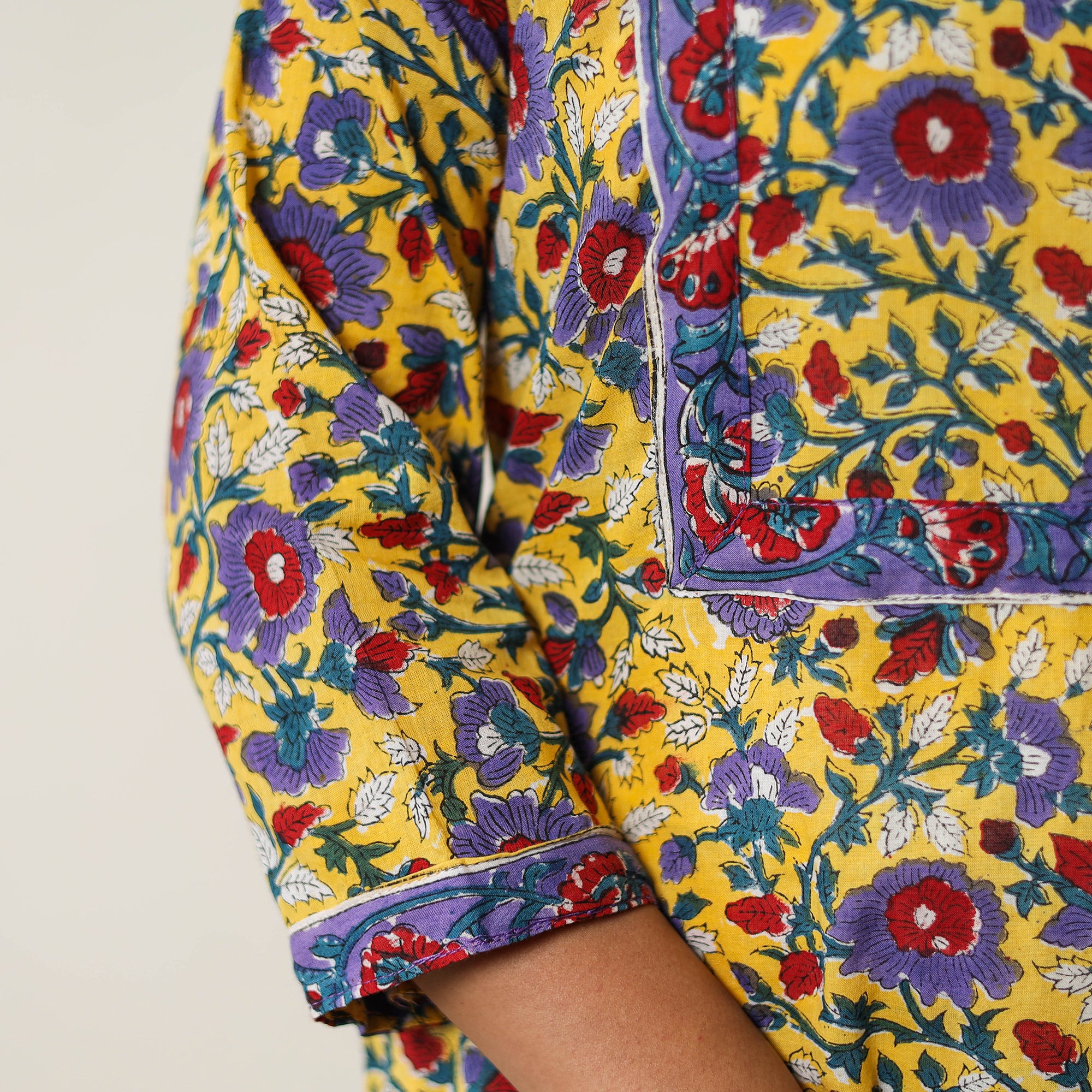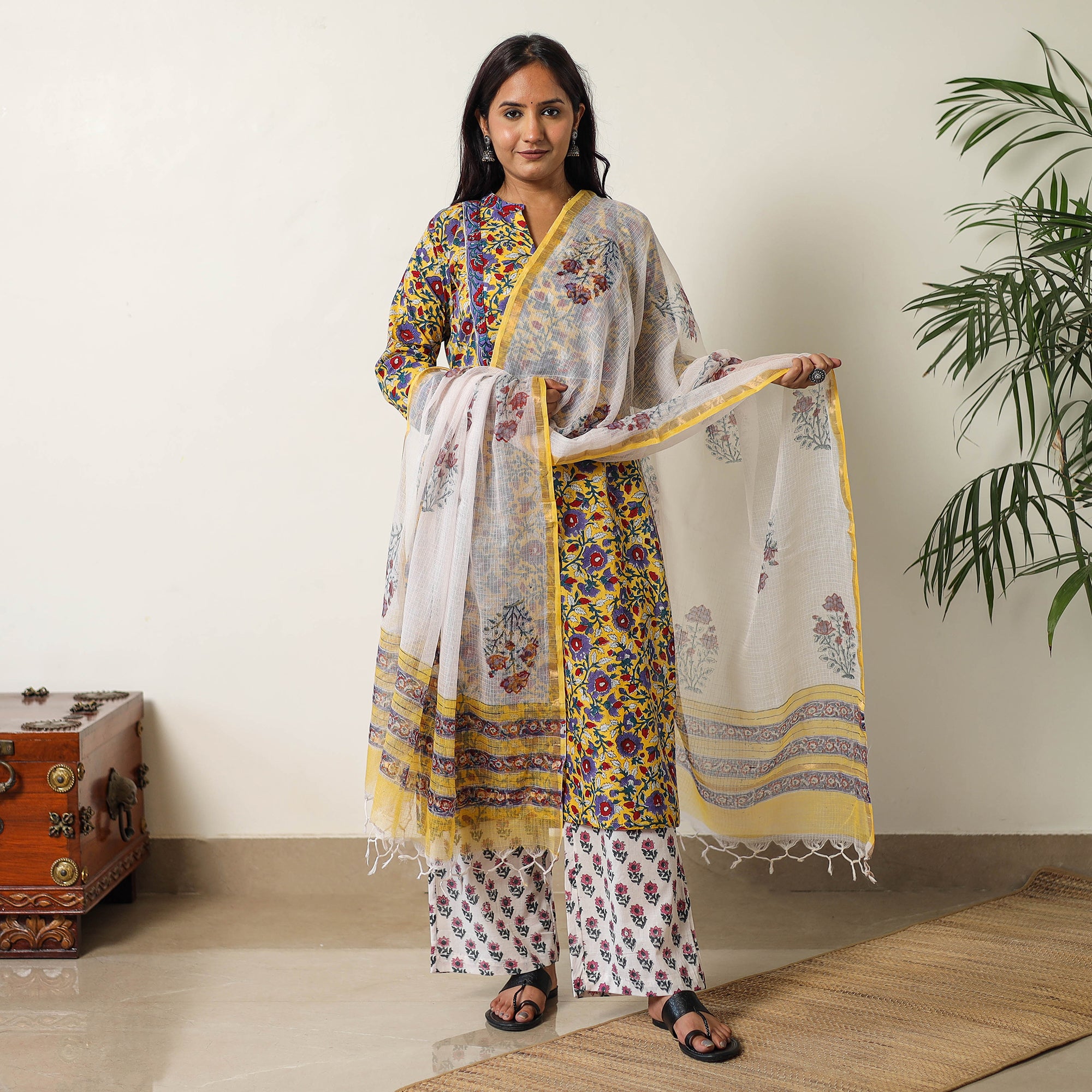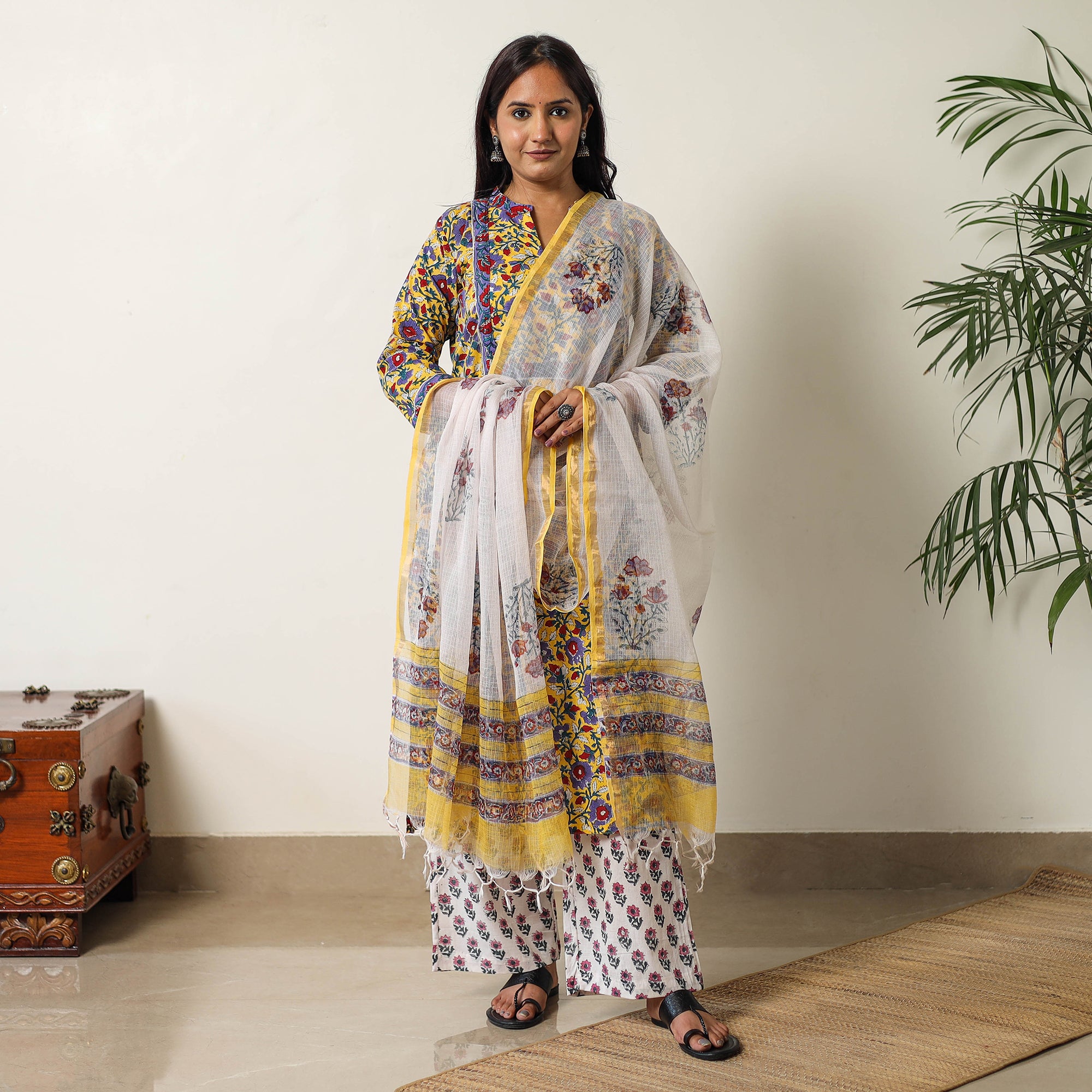 Look and feel beautiful in this uniquely designed sanganeri block-printed cotton kurta with palazzo & dupatta set. This suit set contains a cotton kurta, palazzo, and kota doria dupatta. The kurta has one side pocket, and the palazzo has two side pockets. This cotton suit makes you comfortable all day long. This suit is perfect for your daily outing and for a special occasion.