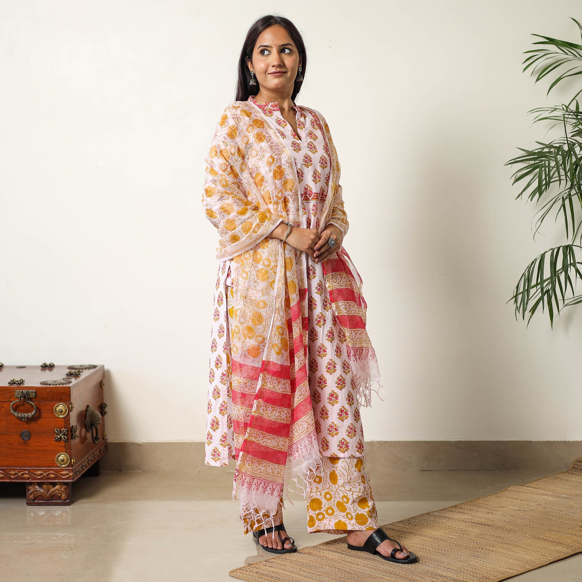 Look and feel beautiful in this uniquely designed sanganeri block-printed cotton kurta with palazzo & dupatta set. This suit set contains a cotton kurta, palazzo, and kota doria dupatta. The kurta has one side pocket, and the palazzo has two side pockets. This cotton suit makes you comfortable all day long. This suit is perfect for your daily outing and for a special occasion.