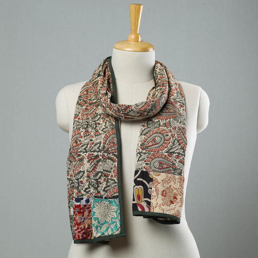 A fine-quality multicolor kalamkari block-printed cotton patchwork stole showcases intricate traditional Indian designs. It's crafted by skilled artisans, featuring vibrant colors and detailed patterns, perfect for adding elegance to any outfit. Kalamkari is the earliest and more complex technique of block printing.