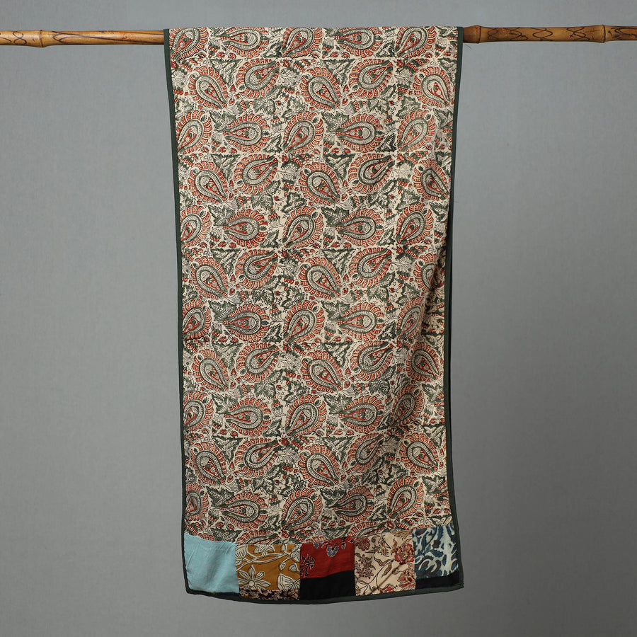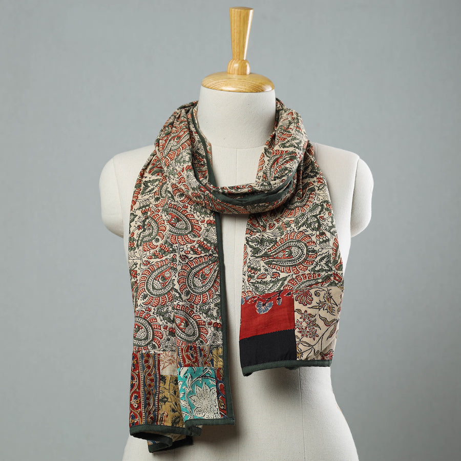 A fine-quality multicolor kalamkari block-printed cotton patchwork stole showcases intricate traditional Indian designs. It's crafted by skilled artisans, featuring vibrant colors and detailed patterns, perfect for adding elegance to any outfit. Kalamkari is the earliest and more complex technique of block printing.