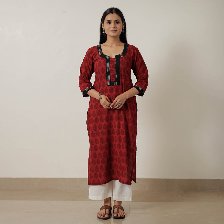 Look and feel beautiful in this uniquely designed red block print mul cotton straight bagh kurta. This kurta is crafted from natural-dyed mul cotton fabric, ensuring a comfortable feel against your skin. Complete with a side pocket, it offers both functionality and fashion-forward appeal. It is adorned with ikat fabric lace.