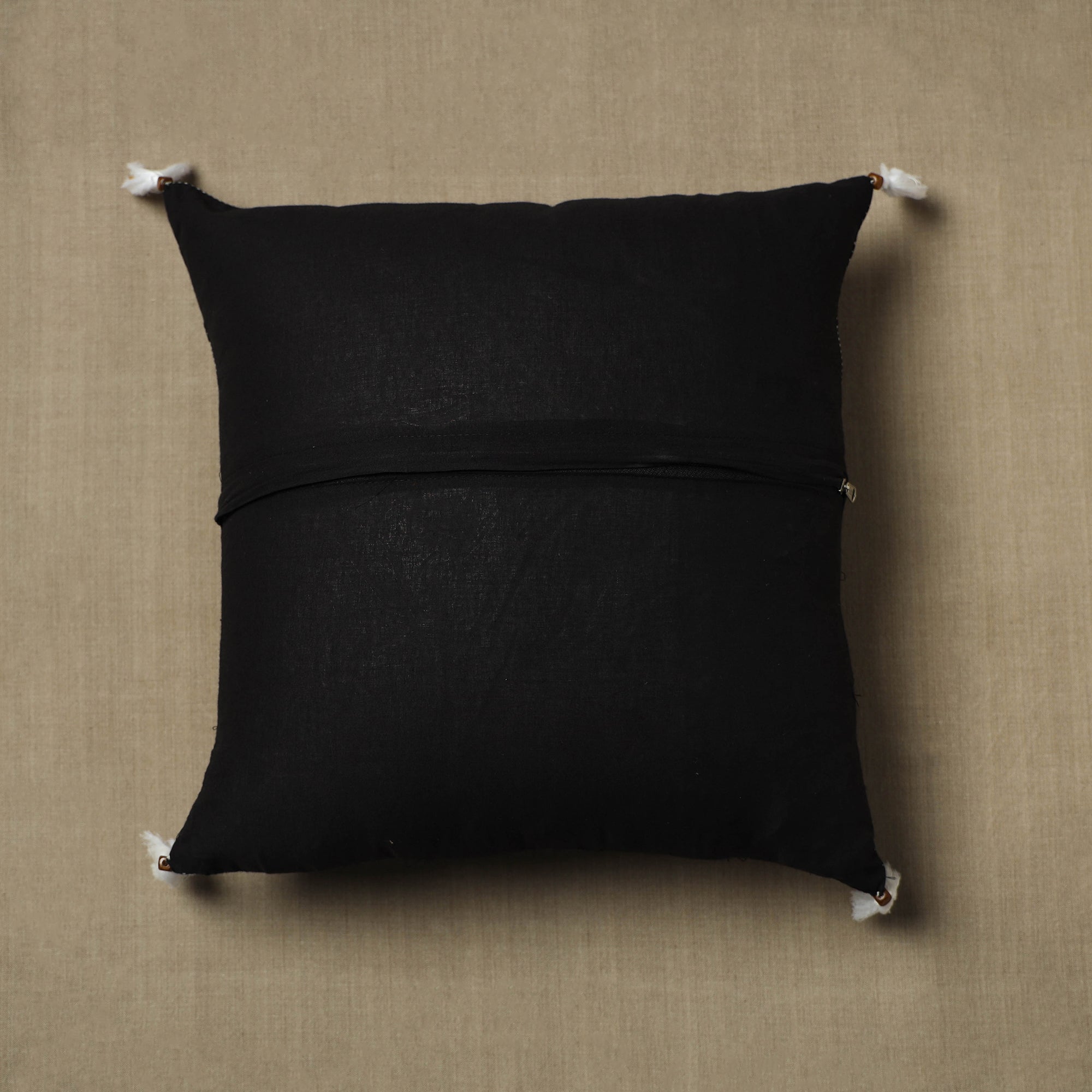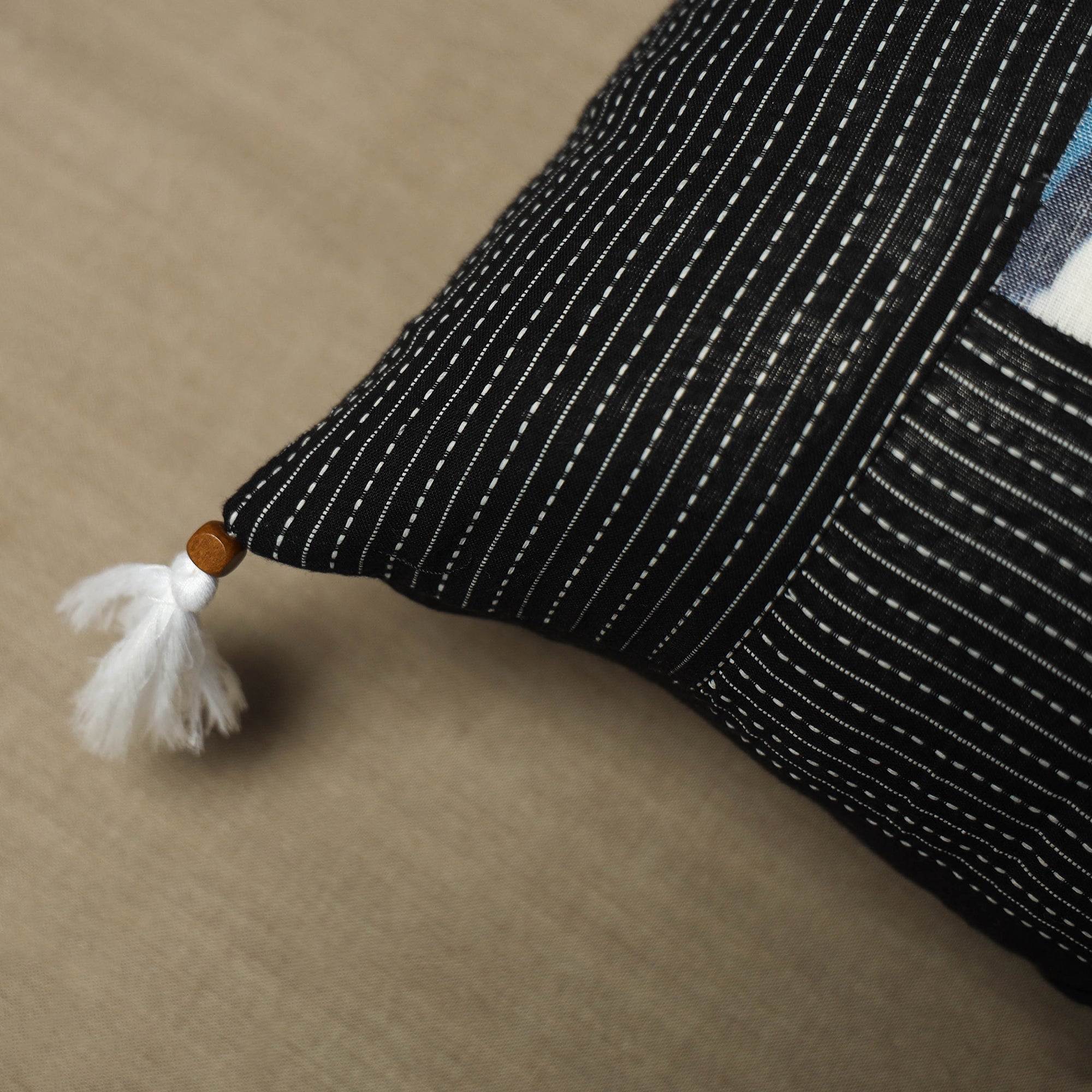 Black kantha stitch ikat cotton cushion cover combines intricate hand-stitched patterns and vibrant, resist-dyed Ikat fabric, creating a soft, durable, and visually striking addition to various home decor styles.