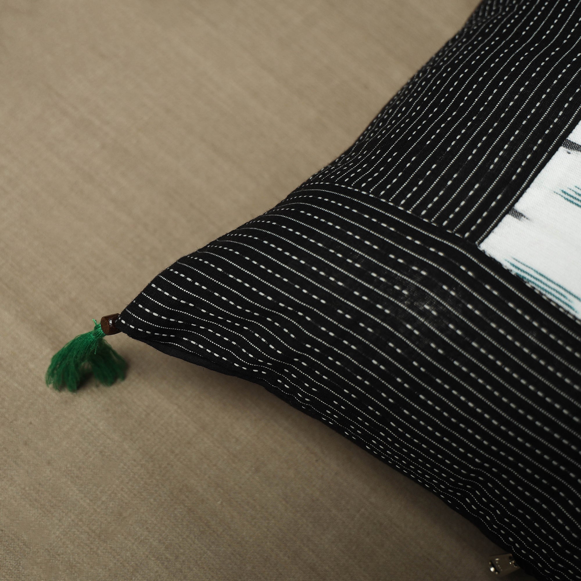 Black kantha stitch ikat cotton cushion cover combines intricate hand-stitched patterns and vibrant, resist-dyed Ikat fabric, creating a soft, durable, and visually striking addition to various home decor styles.