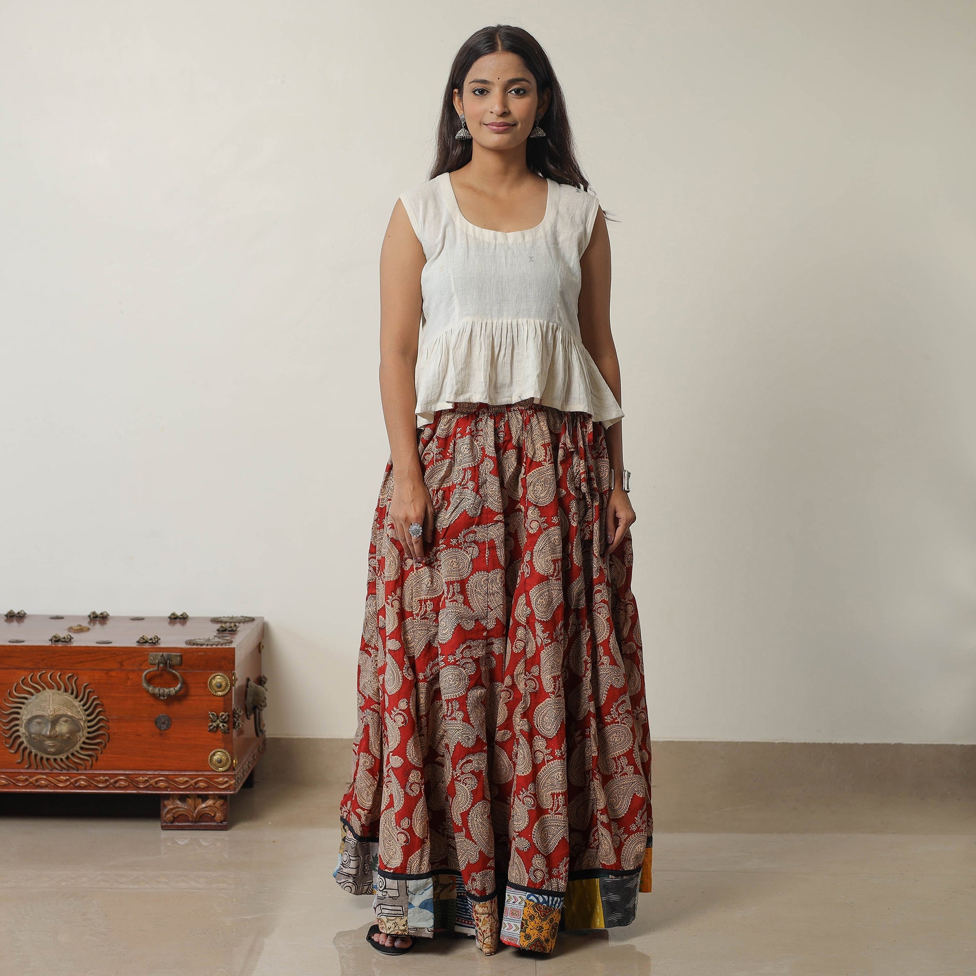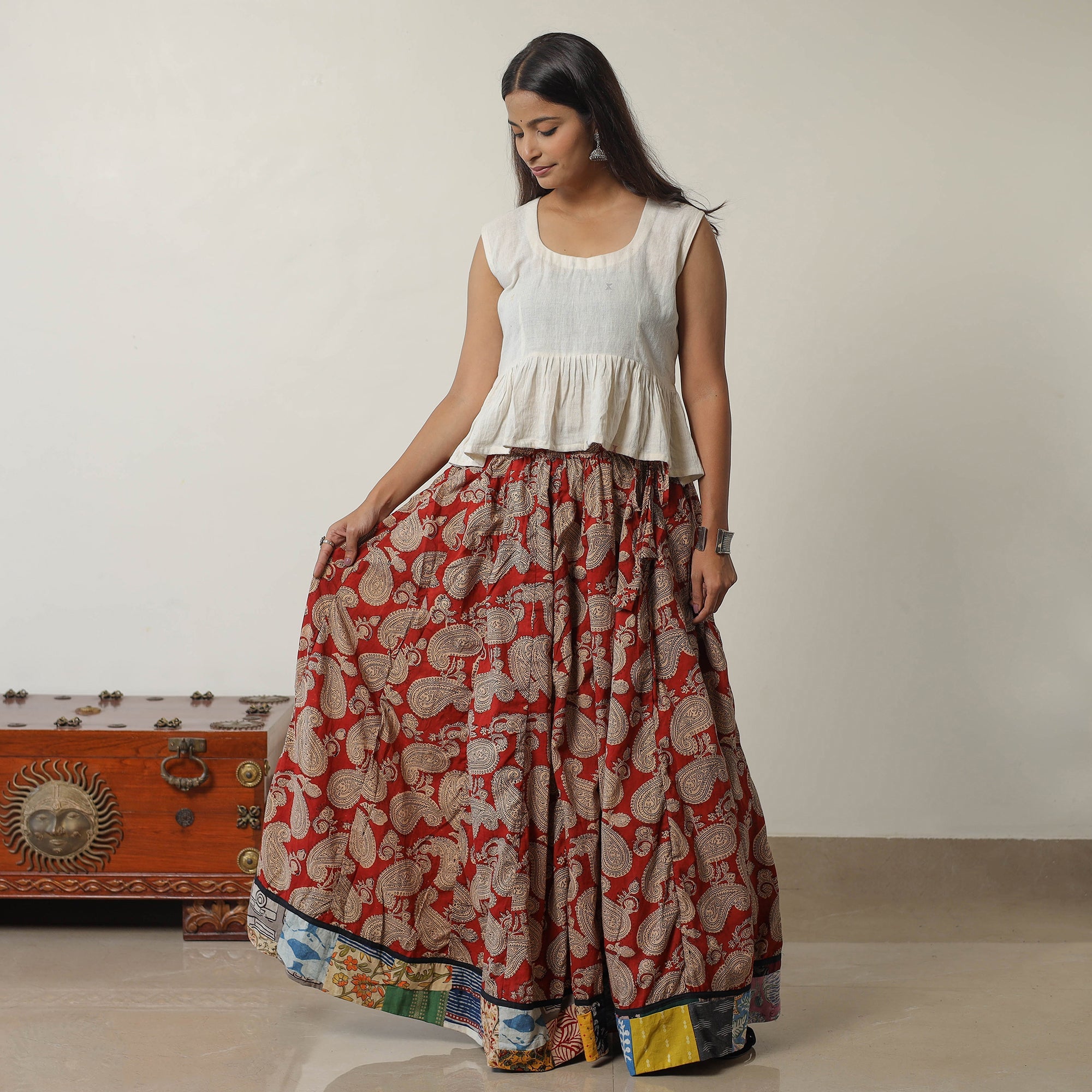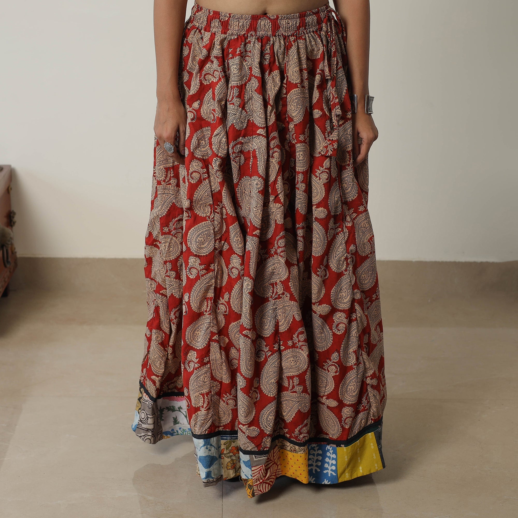 Red - Bagru Block Printed 24 Kali Patchwork Cotton Long Skirt 11