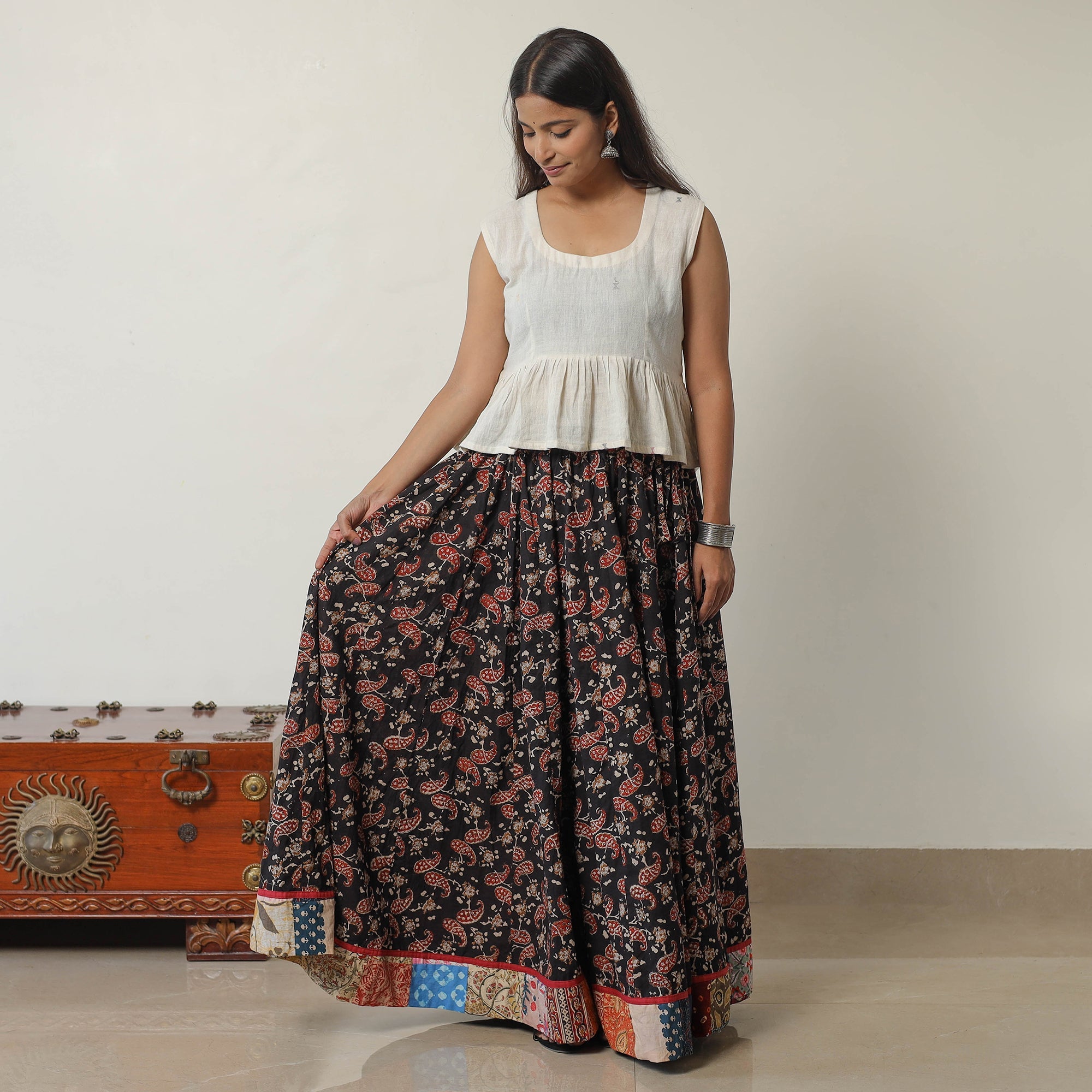 Elevate your wardrobe with our patchwork long skirt, skillfully crafted from bagru block-printed, natural-dyed cotton fabric. This skirt boasts a waist tie-up closure, allowing for a customized and comfortable fit. The intricate patterns and vibrant colors reflect the cultural heritage of Rajasthan.