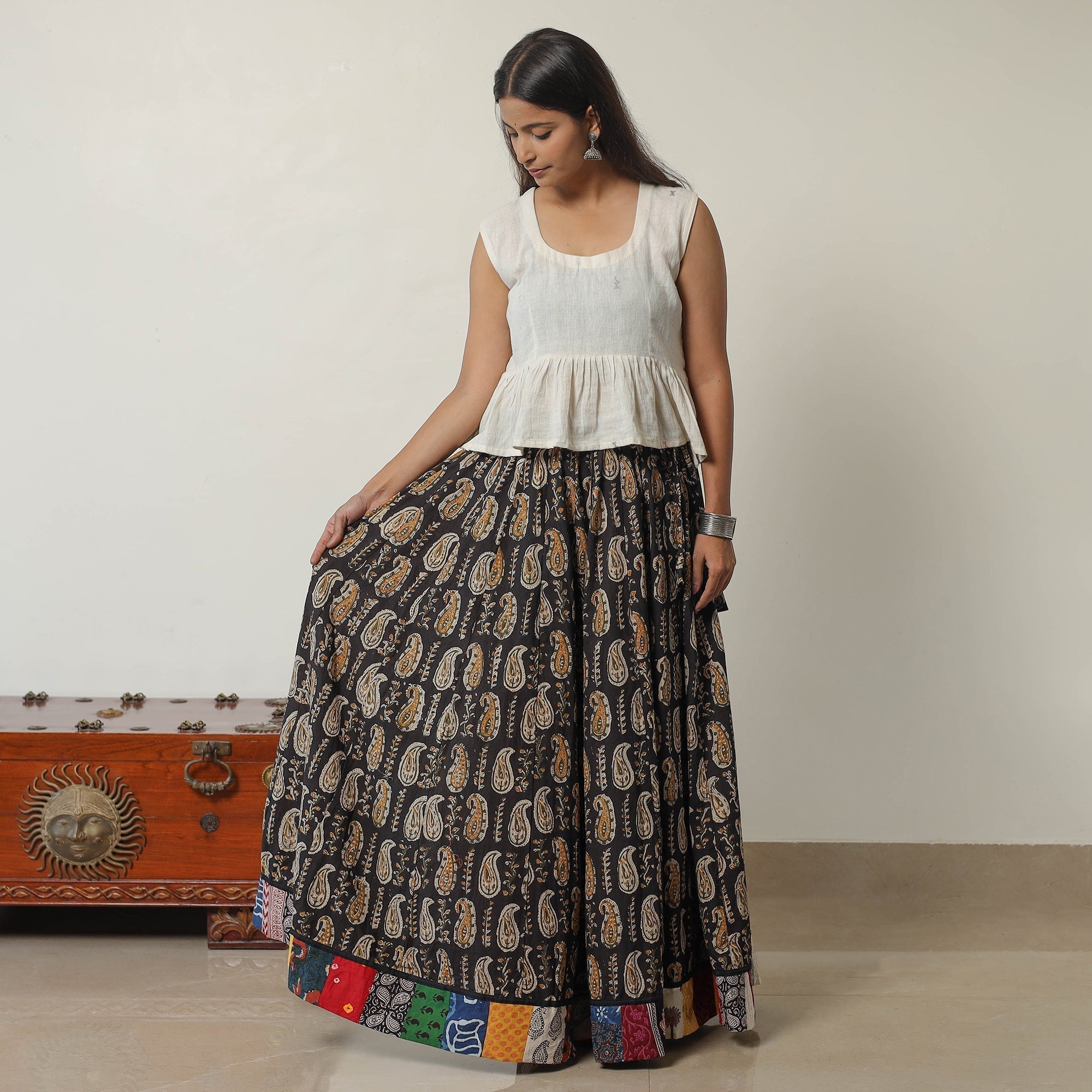 | Material | Elevate your wardrobe with our patchwork long skirt, skillfully crafted from bagru block-printed, natural-dyed cotton fabric. This skirt boasts a waist tie-up closure, allowing for a customized and comfortable fit. The intricate patterns and vibrant colors reflect the cultural heritage of Rajasthan. |
