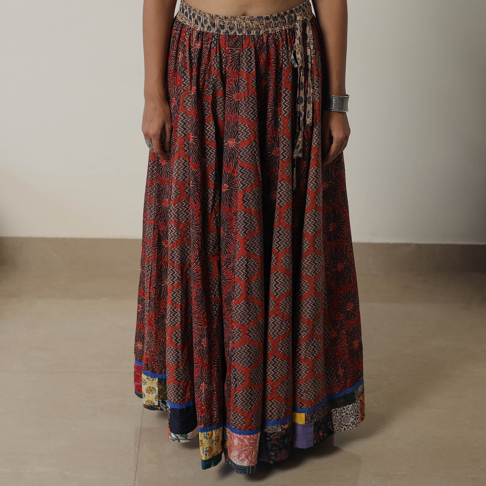 Elevate your wardrobe with our brown patchwork long skirt, skillfully crafted from ajrakh block-printed, natural-dyed cotton fabric. This skirt boasts a waist tie-up closure, allowing for a customized and comfortable fit. The intricate patterns and vibrant colors reflect the cultural heritage of Gujarat.