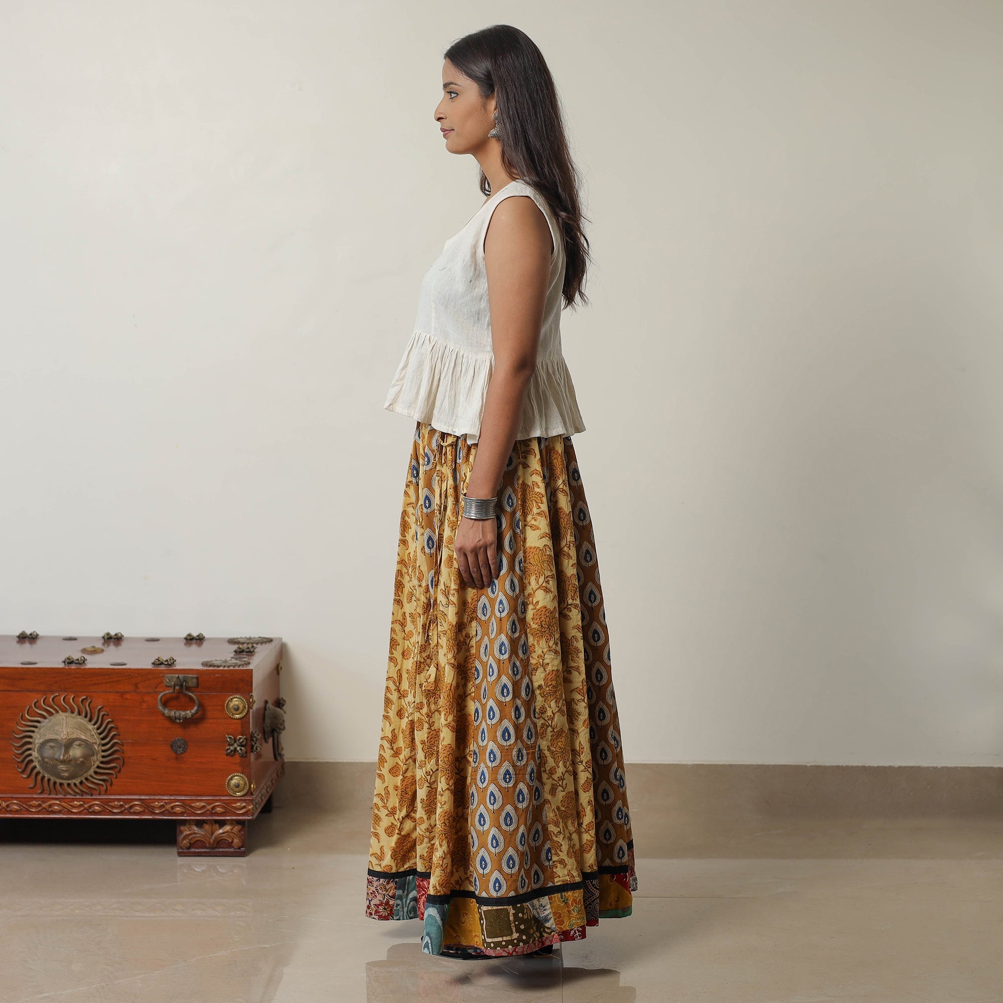 Elevate your wardrobe with our patchwork long skirt, skillfully crafted from bagru block-printed, natural-dyed cotton fabric. This skirt boasts a waist tie-up closure, allowing for a customized and comfortable fit. The intricate patterns and vibrant colors reflect the cultural heritage of Rajasthan.