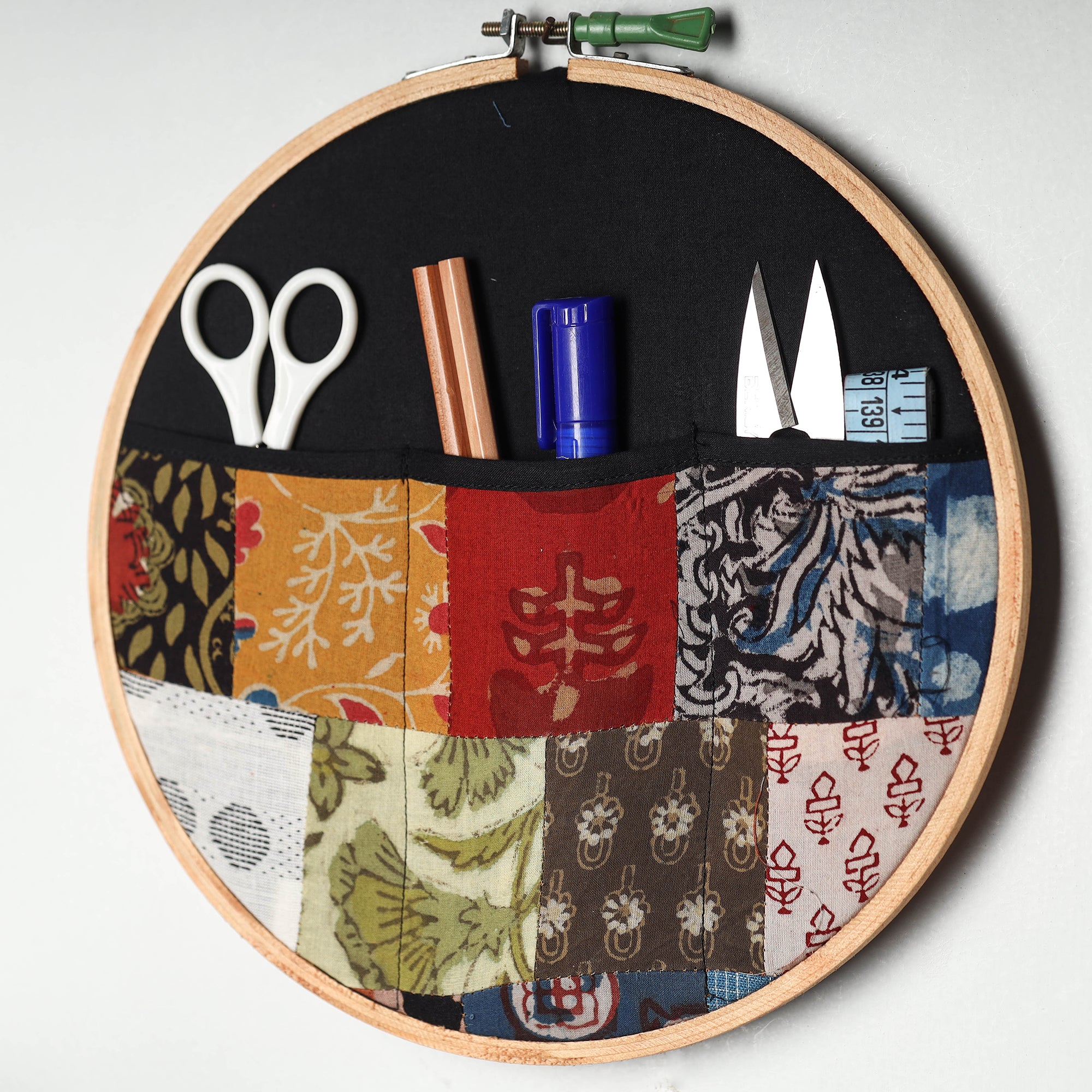 Handcrafted embroidery hoop patchwork wall decor is a unique and beautiful addition to any home, offering a stylish way to decorate your home. This hoop wall decor is made from mixed cotton fabrics, handcrafted by skilled artisans. Featuring three functional pockets for added practicality and charm for organizing essentials or displaying decor.
