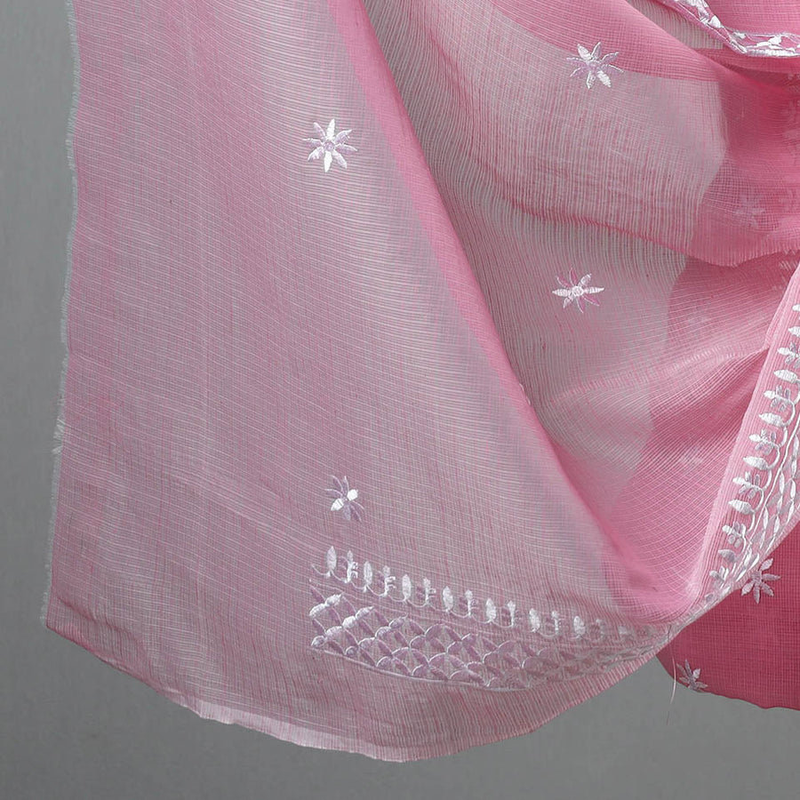 This 3-piece kota doria cotton embroidered suit material set features a kurta and dupatta made of fine-quality kota doria silk cotton fabric with delicate embroidery, paired with a chikankari bottom material. Kota doria is a blend of strong cotton and lustrous silk yarns. The fabric is known for its lightweight and sheer texture, which gives it an exquisite grace of its own.