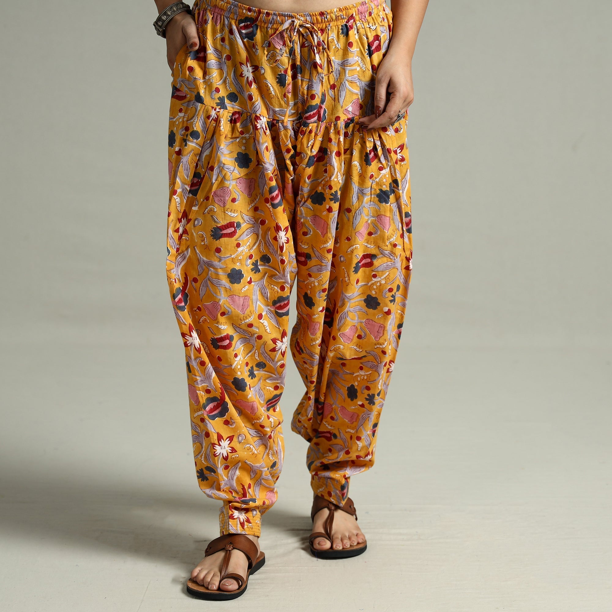 | Material | Elevate your style with this stunning sanganeri hand-block printed cotton elasticated salwar. This cotton salwar features an elasticized waist with a drawstring element that adds to the comfort quotient. This salwar is perfect for daily outings and comes with a convenient side pocket. |