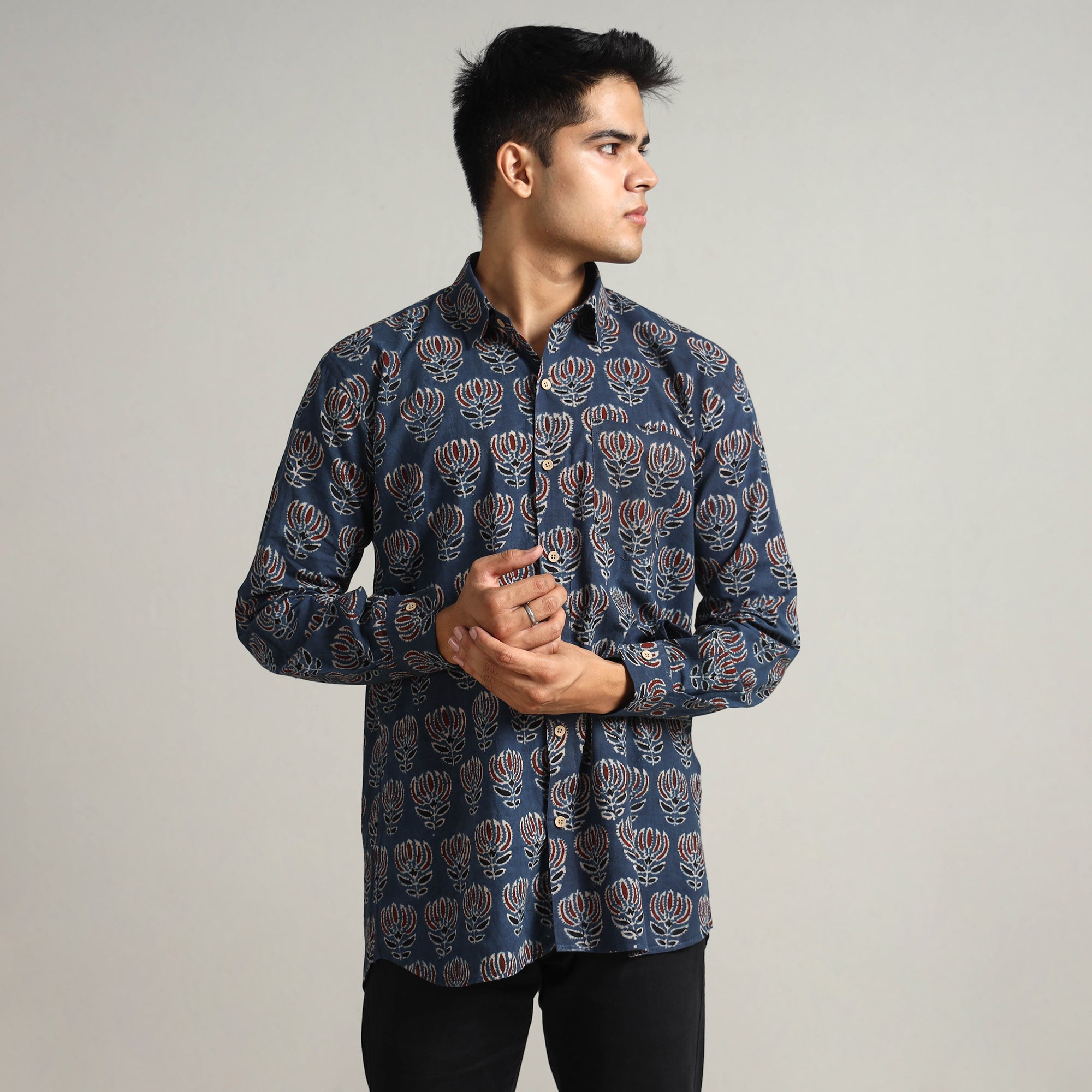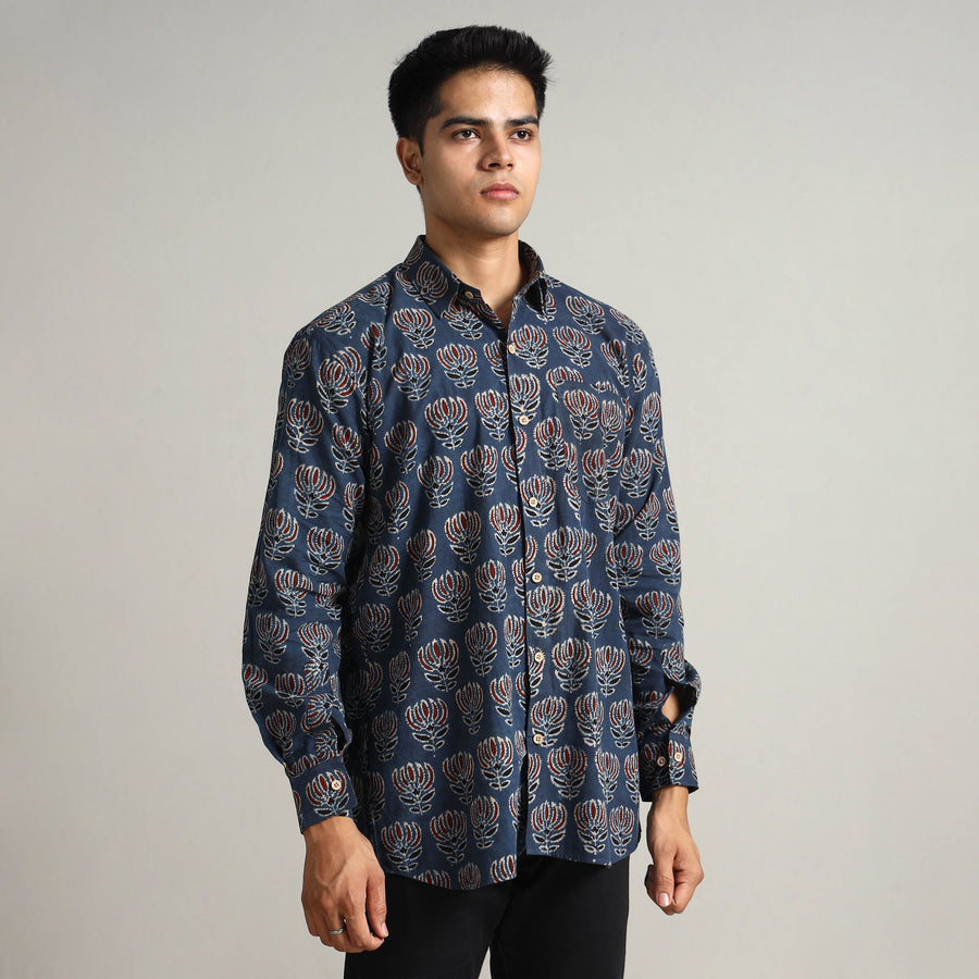This ajrakh block-printed cotton men's full-sleeve shirt. This shirt is carefully crafted using natural-dyed cotton fabric, which ensures all-day comfort. The crisp wooden buttons add a touch of natural charm, while the patch pocket on the front offers convenience and practicality.