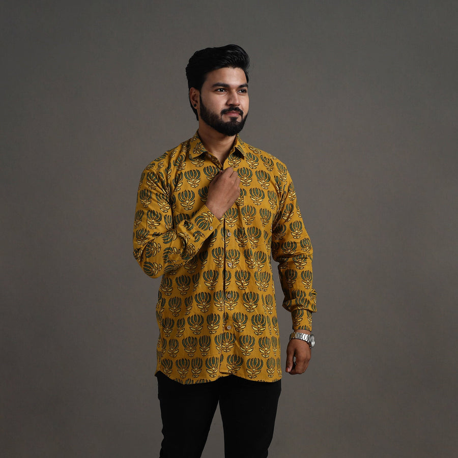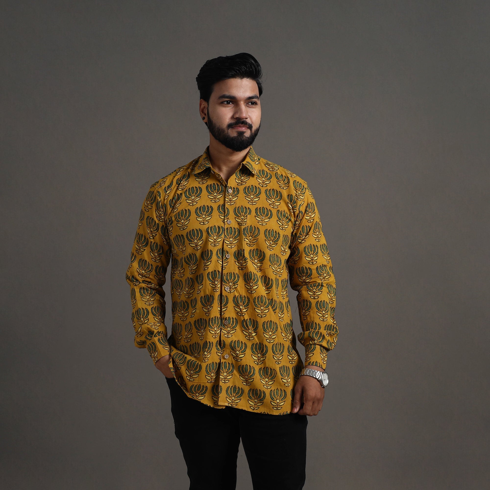 This yellow ajrakh block-printed cotton men's full-sleeve shirt. This shirt is carefully crafted using natural-dyed cotton fabric, which ensures all-day comfort. The crisp wooden buttons add a touch of natural charm, while the patch pocket on the front offers convenience and practicality. |