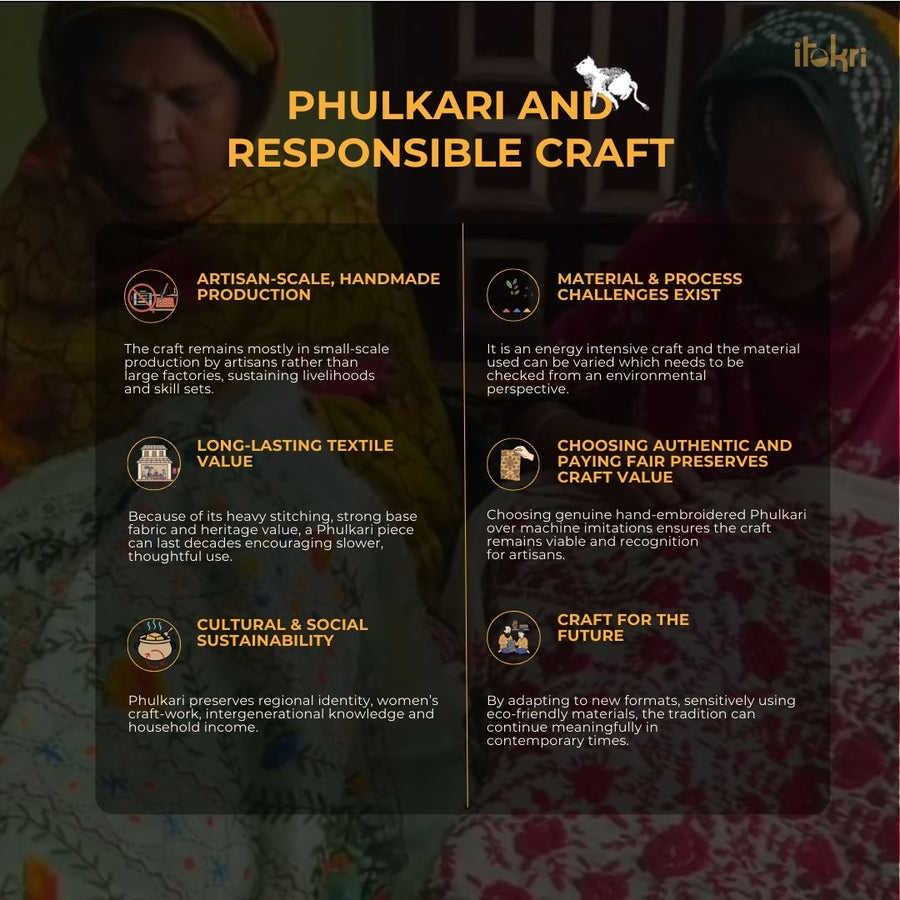 Phulkari is a supremely refined embroidery work practiced in the Punjab region. The meaning of the word phul is flower while Kari means to craft. It is the art of creating beautiful intricate designs and motifs on fabrics using different colored threads.