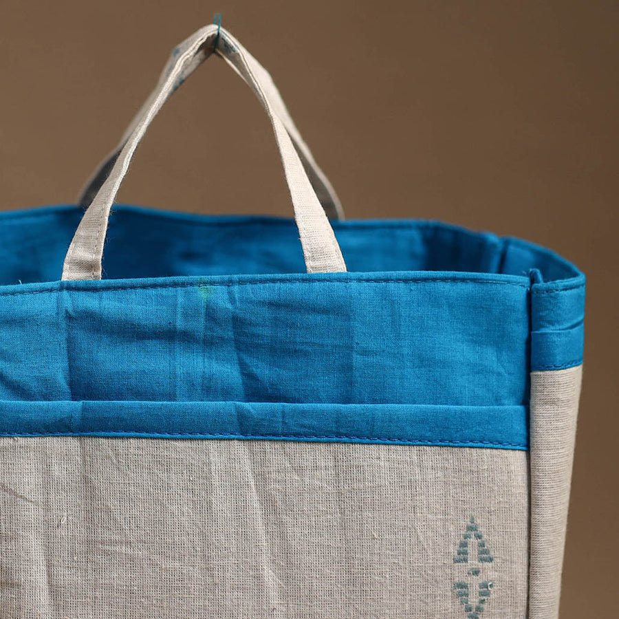 Handmade multipurpose cosmetic/toiletry bag. This bag is crafted from cotton fabric with a spill-proof layer inside, textured with handmade textiles from India. It has two simple pockets, one zipper pocket inside, and four convenient pockets on the outside.