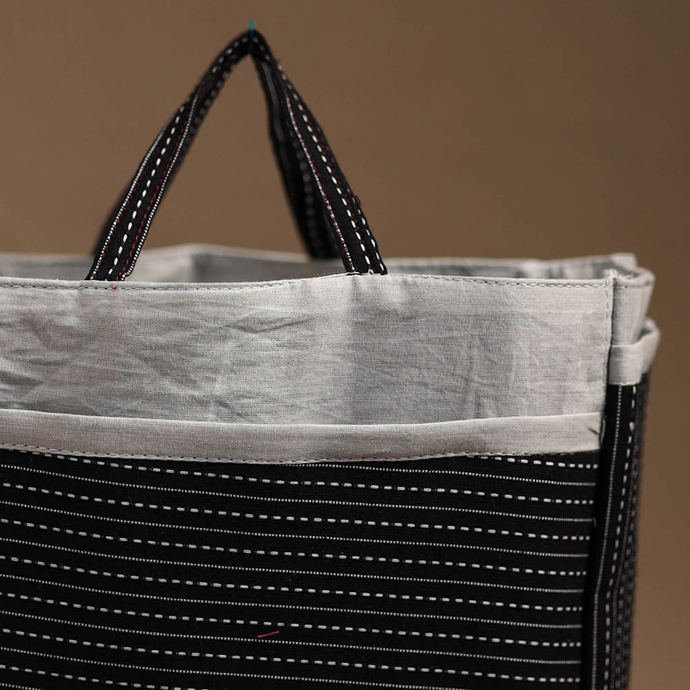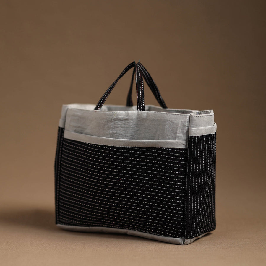 Handmade multipurpose cosmetic/toiletry bag. This bag is crafted from cotton fabric with a spill-proof layer inside, textured with handmade textiles from India. It has two simple pockets, one zipper pocket inside, and four convenient pockets on the outside.