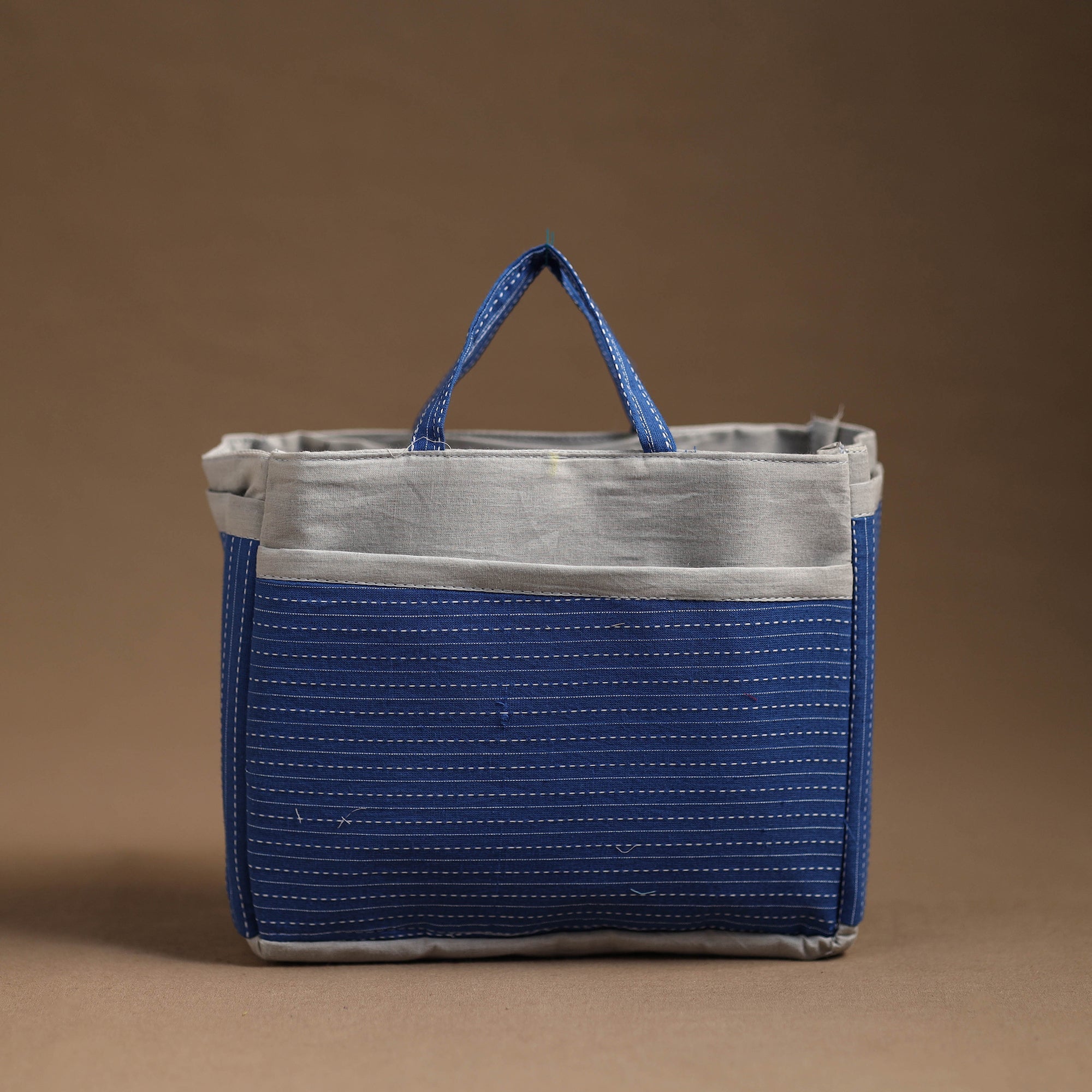 Handmade multipurpose cosmetic/toiletry bag. This bag is crafted from cotton fabric with a spill-proof layer inside, textured with handmade textiles from India. It has two simple pockets, one zipper pocket inside, and four convenient pockets on the outside.