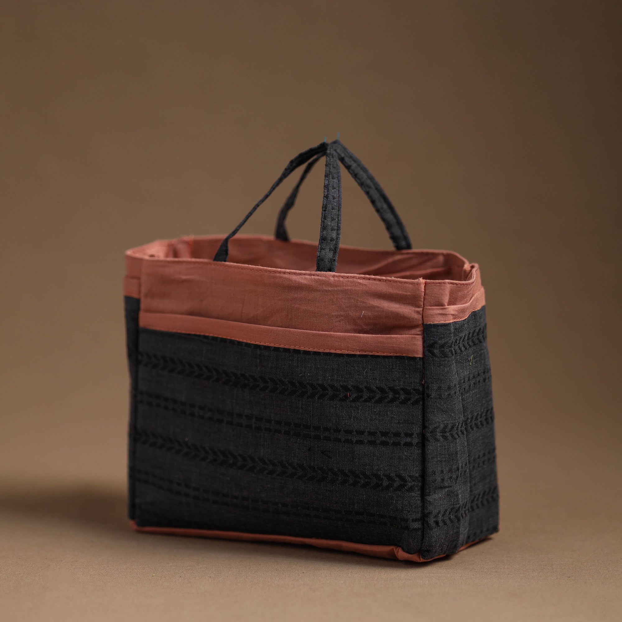 Handmade multipurpose cosmetic/toiletry bag. This bag is crafted from cotton fabric with a spill-proof layer inside, textured with handmade textiles from India. It has two simple pockets, one zipper pocket inside, and four convenient pockets on the outside.
