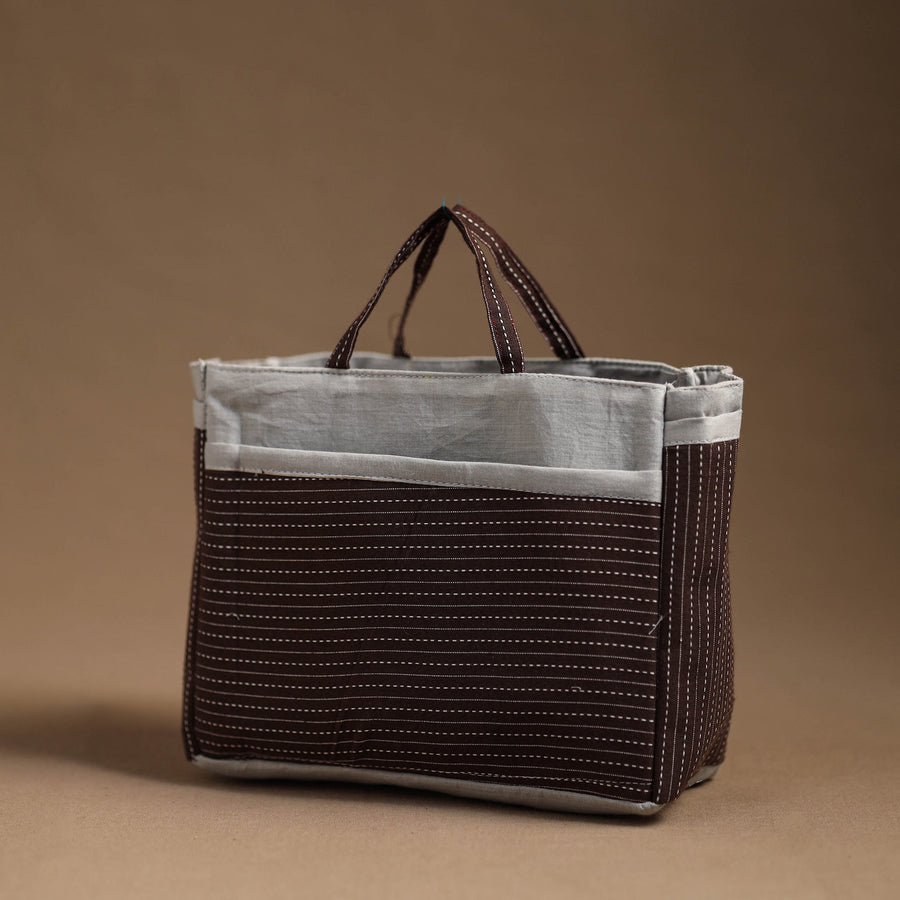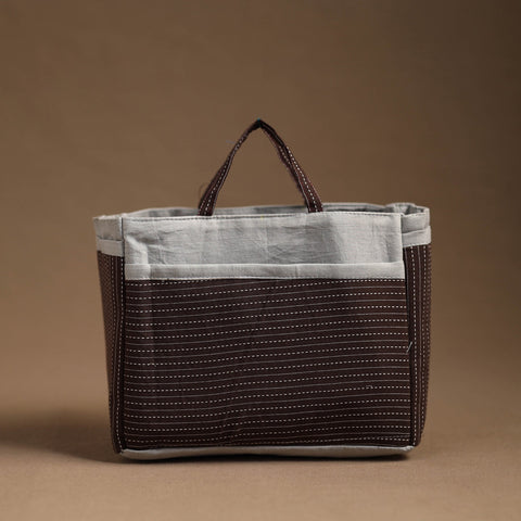 Handmade multipurpose cosmetic/toiletry bag. This bag is crafted from cotton fabric with a spill-proof layer inside, textured with handmade textiles from India. It has two simple pockets, one zipper pocket inside, and four convenient pockets on the outside.