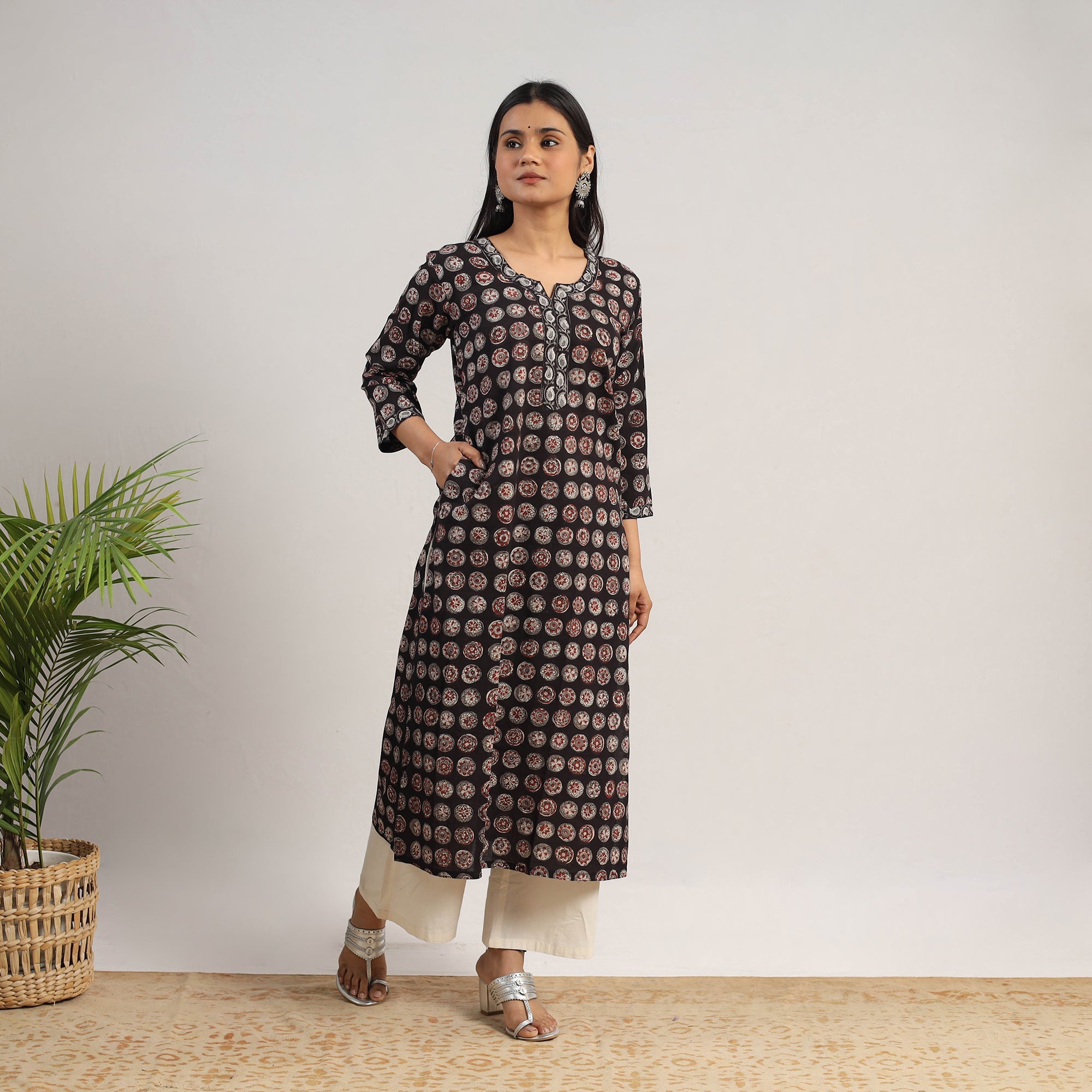 Look and feel beautiful in this uniquely designed black jahota block printed cotton straight kurta. This kurta is made using naturally dyed cotton fabric, ensuring a comfortable feel against your skin. The kurta also features a convenient one-side pocket, perfect for carrying small essentials. It's an ideal choice for both casual and festive occasions.