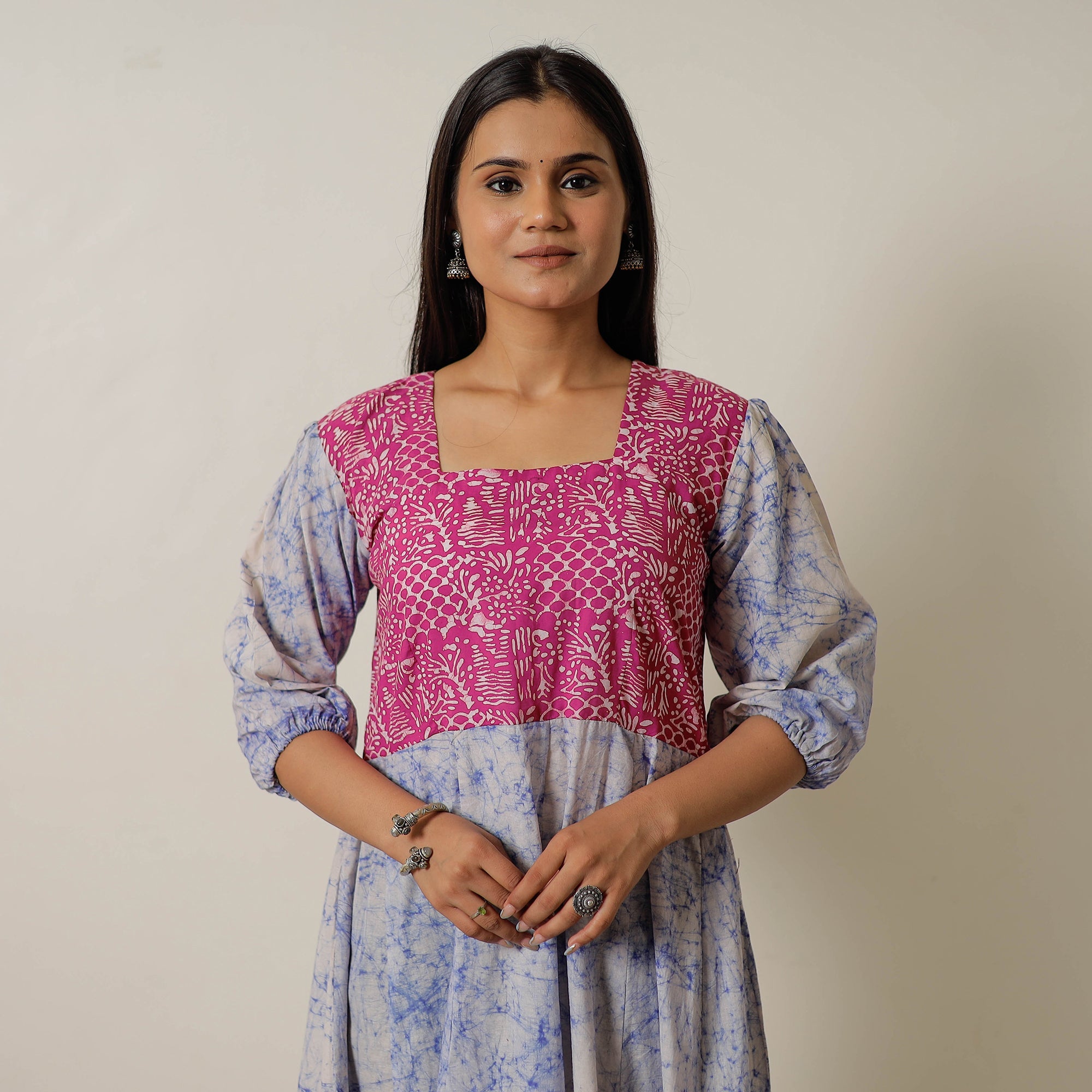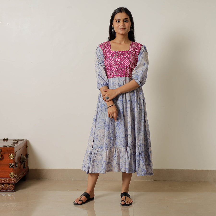 Look and feel beautiful in this uniquely designed, hand-batik-printed cotton flared dress. This cotton dress makes you comfortable all day long. This dress is perfect for your daily outing and for a special occasion.