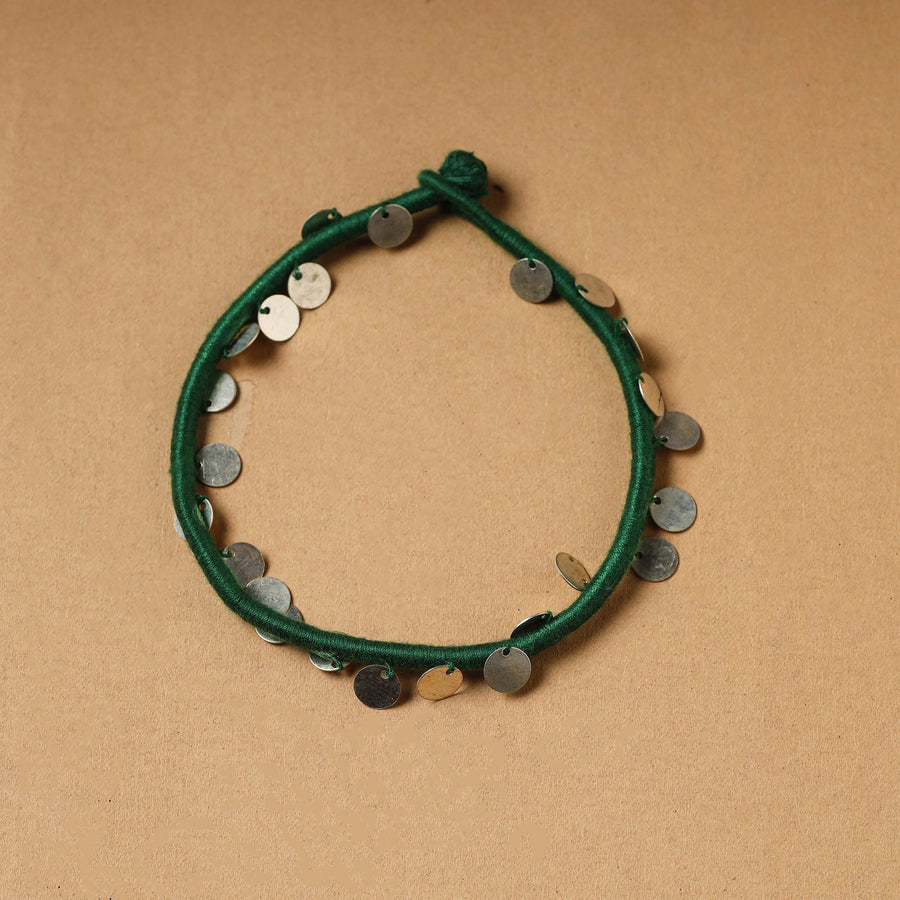 Enhance your traditional look with this handcrafted green patwa thread & sequin work anklet. This patwa anklet is made from thick weaves of thread with sequin work, handcrafted by the master craftsman Kailash Patwa. Patwa is a thread craft that originated in Rajasthan and is now practiced in parts of the state.