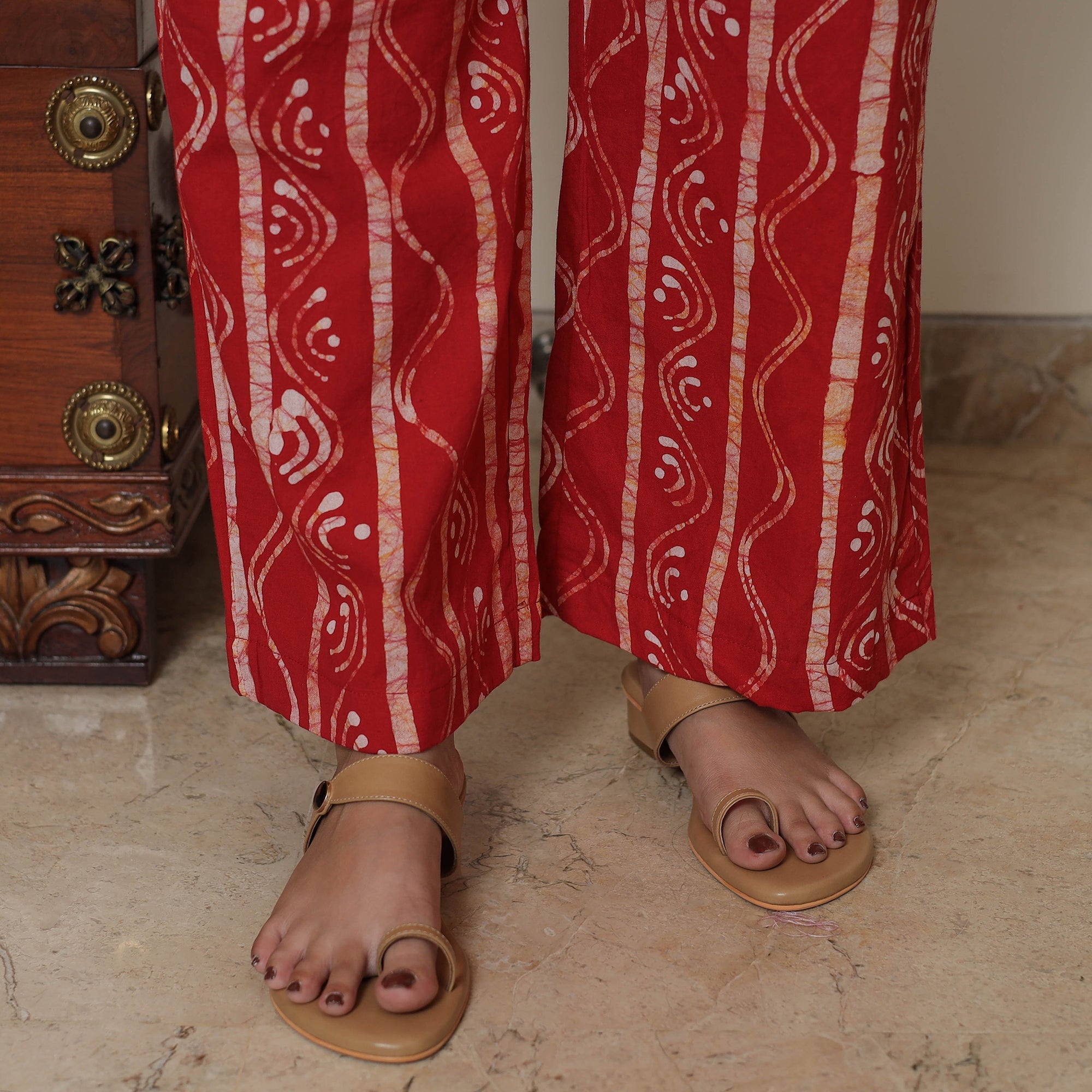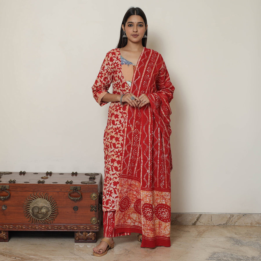 This hand-batik-printed cotton suit set is a perfect choice for a special occasion. The kurta with side pockets and a dupatta is uniquely designed and sure to make you look beautiful. Kurta has a patchwork design, adding a touch of elegance to your ensemble. The cotton palazzo completes the set; the palazzo features an elasticized waist and two side pockets.