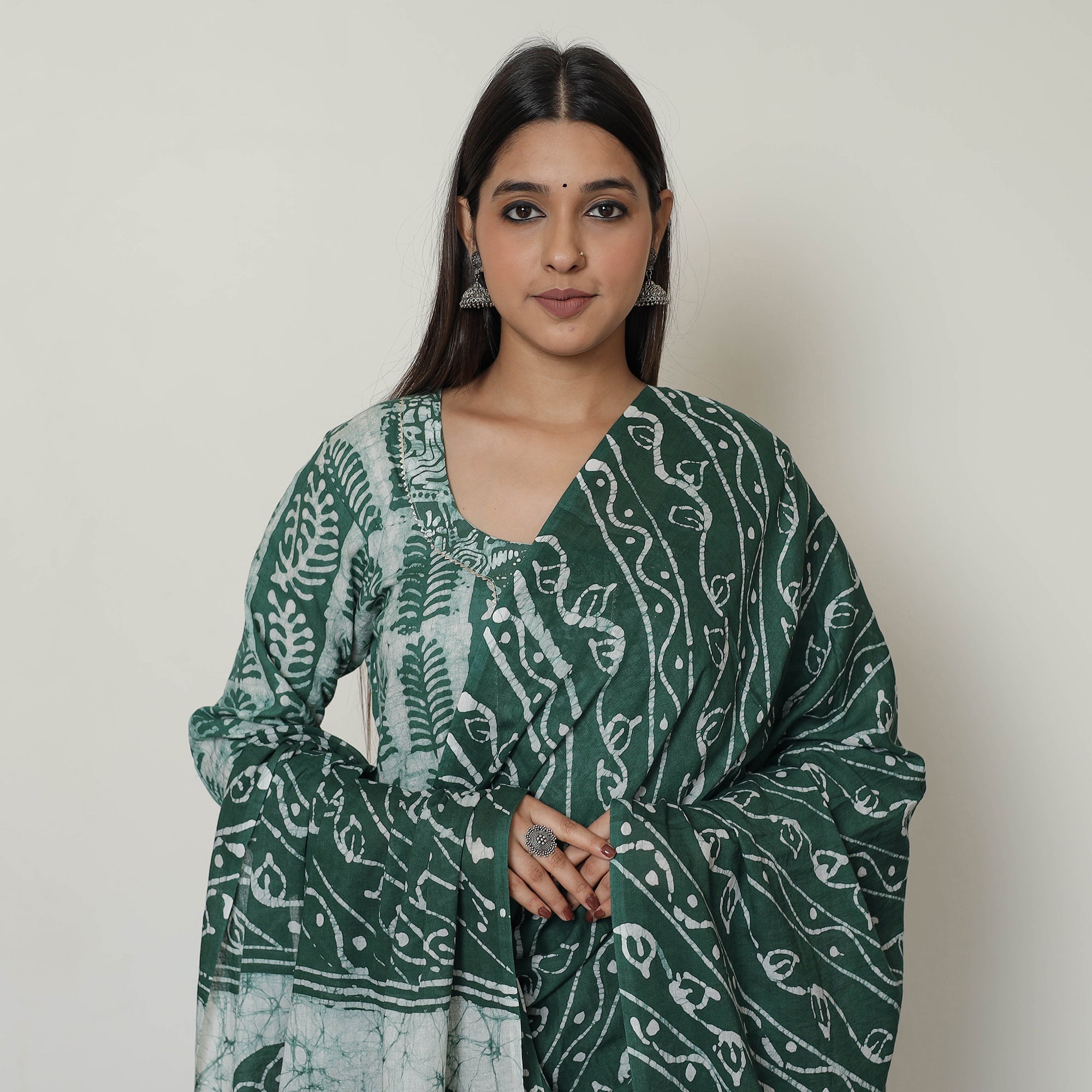 Green - Hand Embroidery Cotton A-Line Batik Print Kurta for women 04