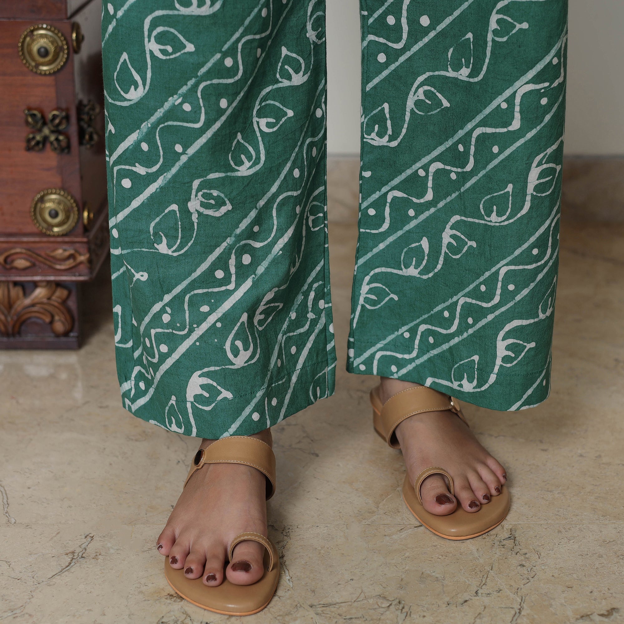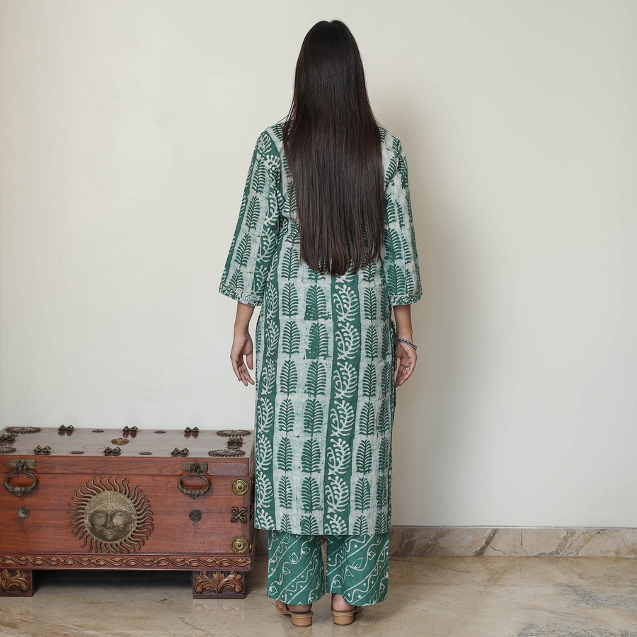 This hand-batik-printed cotton suit set is a perfect choice for a special occasion. The kurta with side pockets and a dupatta is uniquely designed and sure to make you look beautiful. The cotton palazzo completes the set; the palazzo features an elasticized waist and two side pockets.