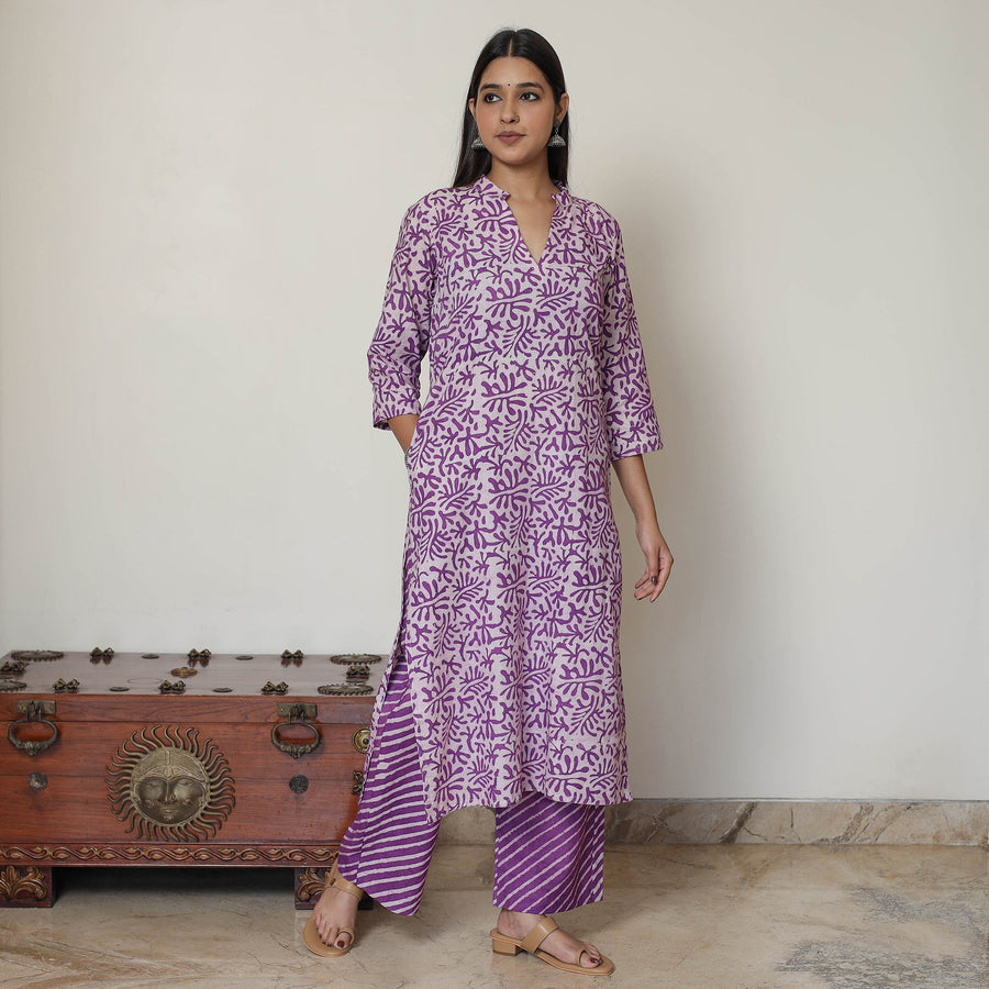 This hand-batik-printed cotton suit set is a perfect choice for a special occasion. The kurta with side pockets and a dupatta is uniquely designed and sure to make you look beautiful. The cotton palazzo completes the set; the palazzo features an elasticized waist and two side pockets.