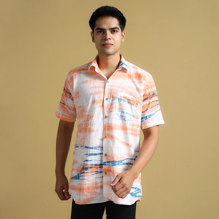 This shibori tie-dye cotton men's half-sleeve shirt is a perfect blend of style and comfort. The shirt's soft and breathable cotton fabric ensures all-day comfort. The crisp wooden buttons add a touch of natural charm, while the patch pocket on the front offers convenience and practicality.