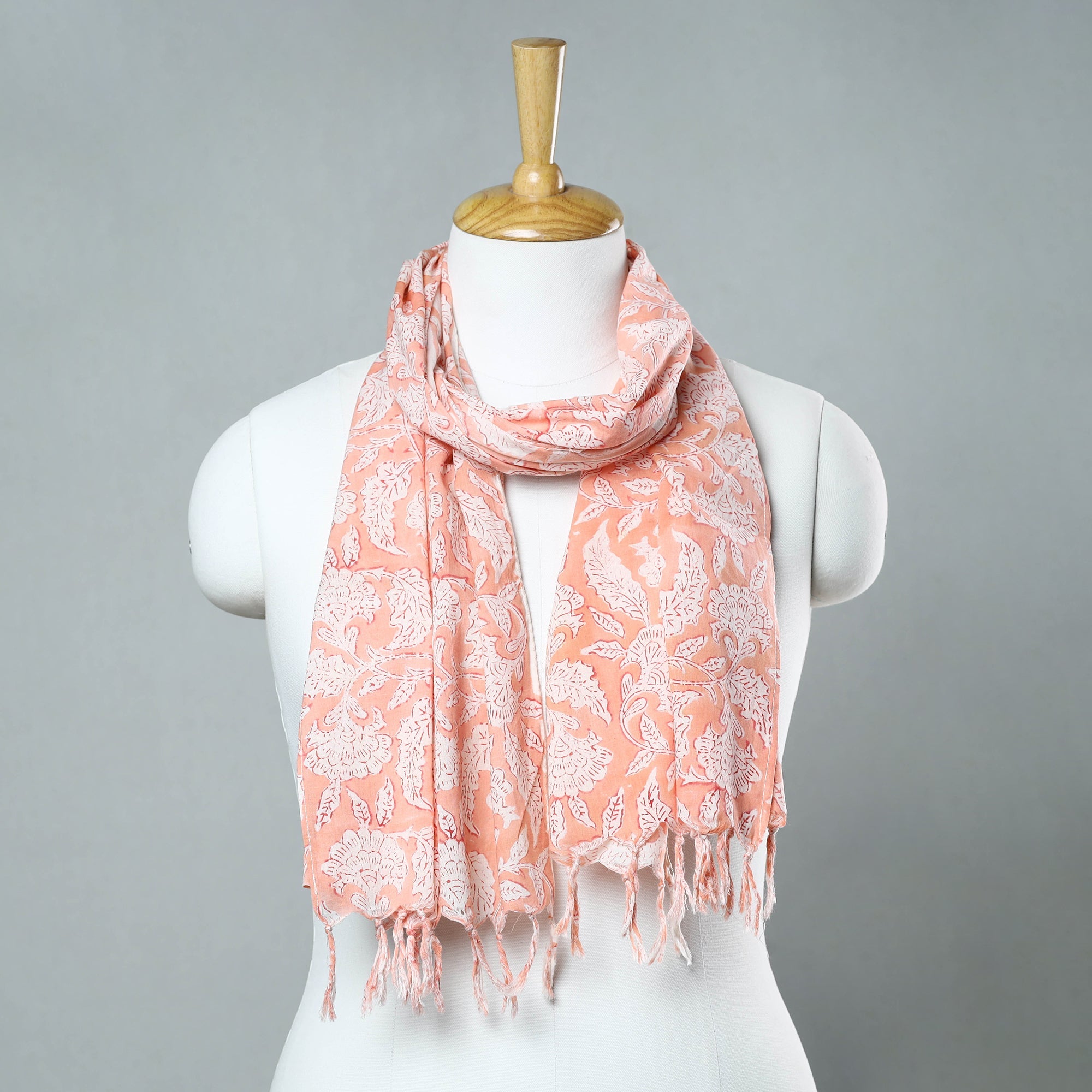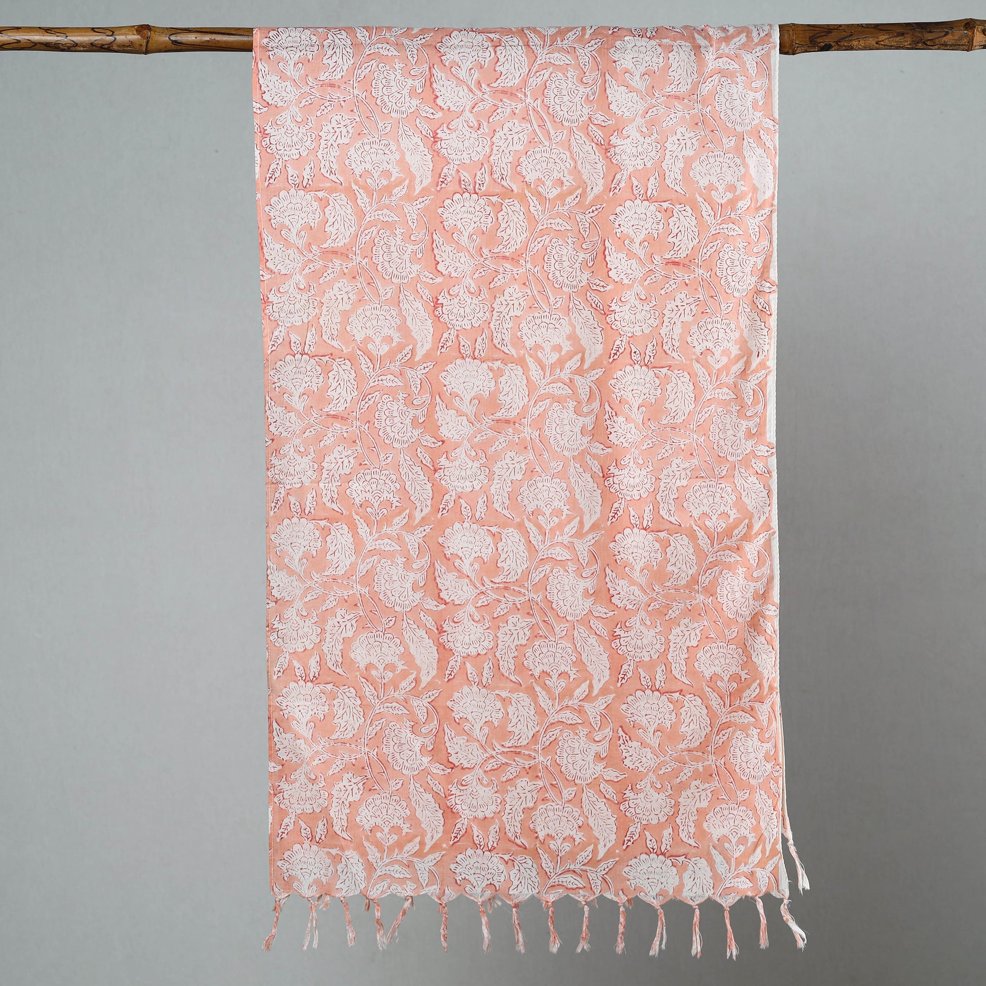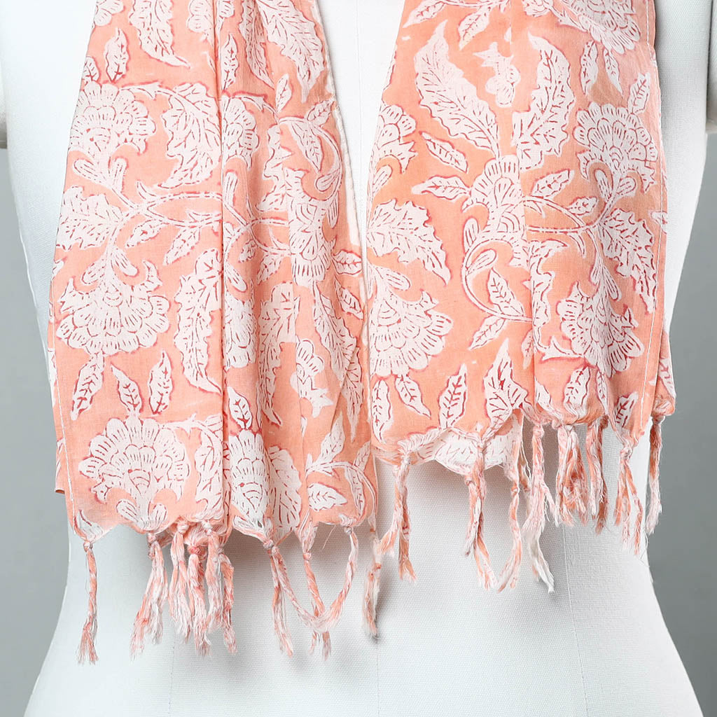 Fine quality delicate sanganeri block printed cotton stole with tassels. Made using VAT dyes, this stole features intricate floral patterns, also known as 'Buttas', which are exclusive to sanganeri prints. The elaborate detailing of the flowers and petals showcases the artistry of this hand-block printing technique originating from Sanganer, Rajasthan.
