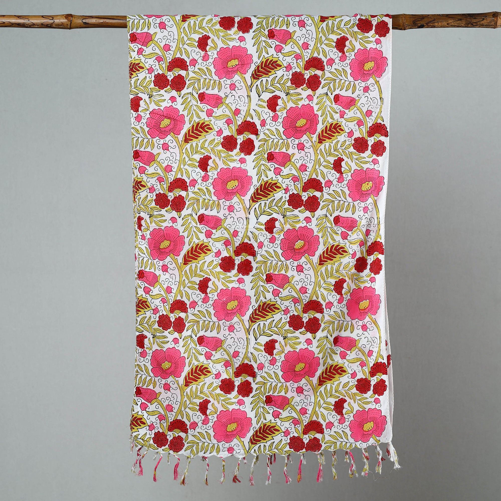 Fine quality delicate sanganeri block printed cotton stole with tassels. Made using VAT dyes, this stole features intricate floral patterns, also known as 'Buttas', which are exclusive to sanganeri prints. The elaborate detailing of the flowers and petals showcases the artistry of this hand-block printing technique originating from Sanganer, Rajasthan.