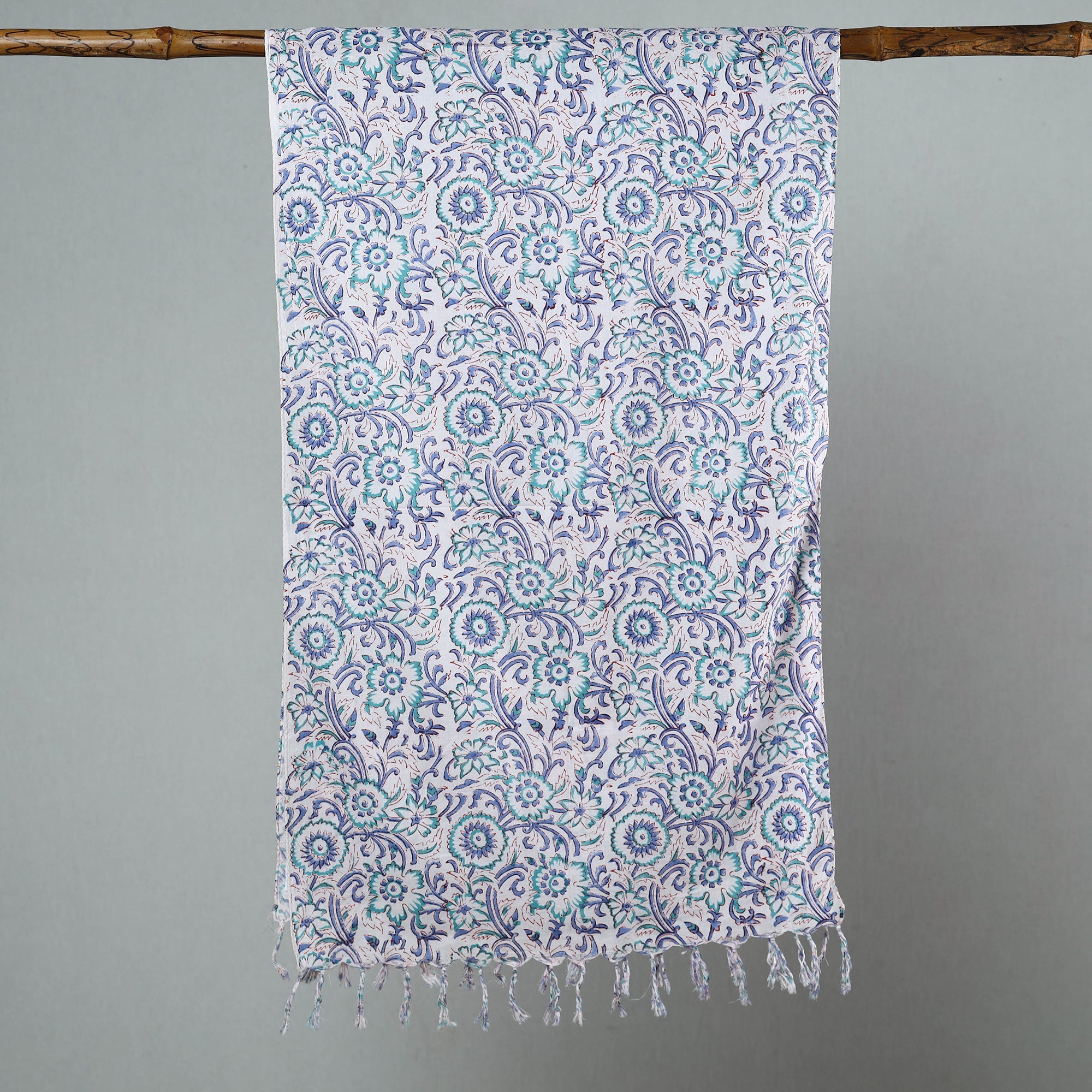 Fine quality delicate sanganeri block printed cotton stole with tassels. Made using VAT dyes, this stole features intricate floral patterns, also known as 'Buttas', which are exclusive to sanganeri prints. The elaborate detailing of the flowers and petals showcases the artistry of this hand-block printing technique originating from Sanganer, Rajasthan.