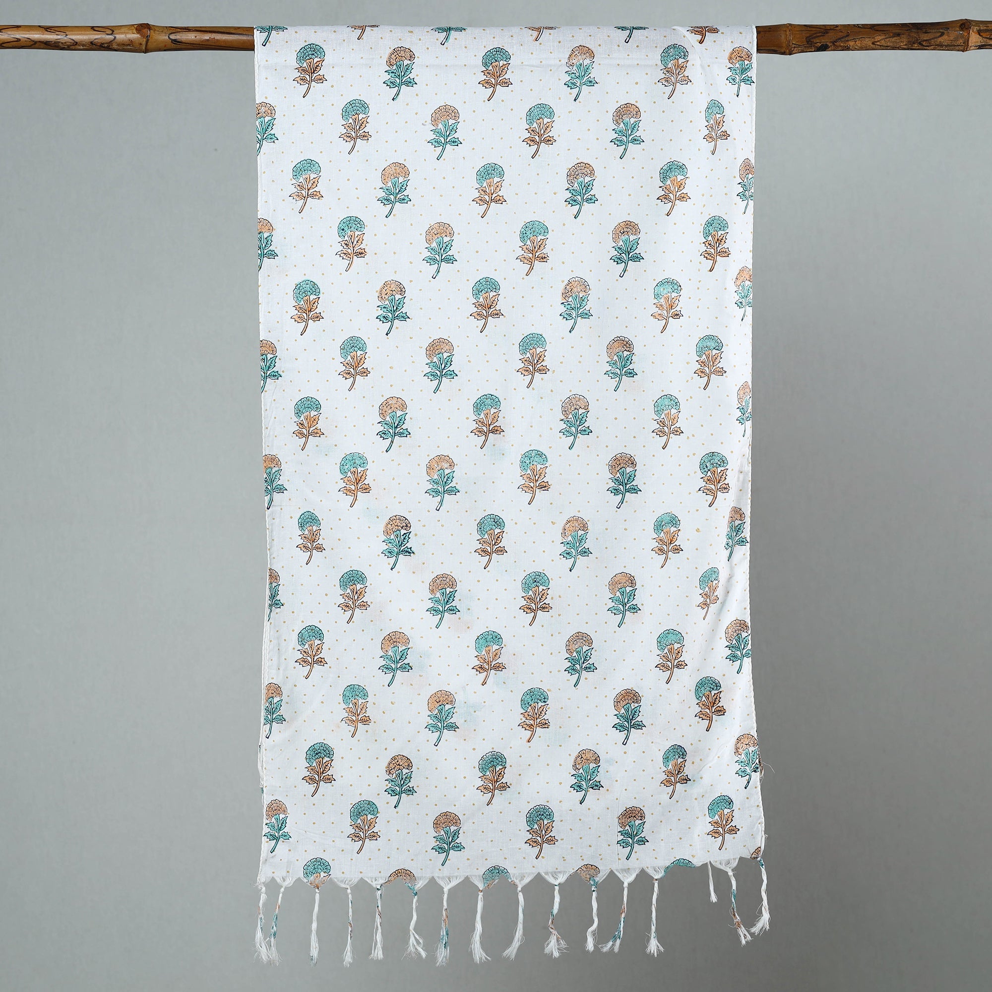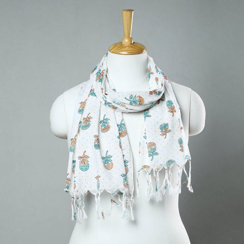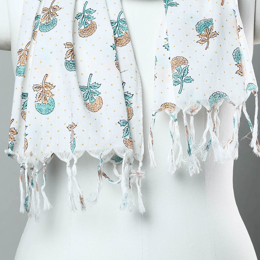 White - Sanganeri Block Printed Cotton Stole with Tassels 164