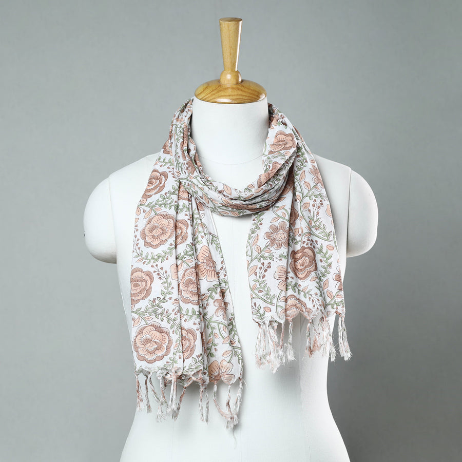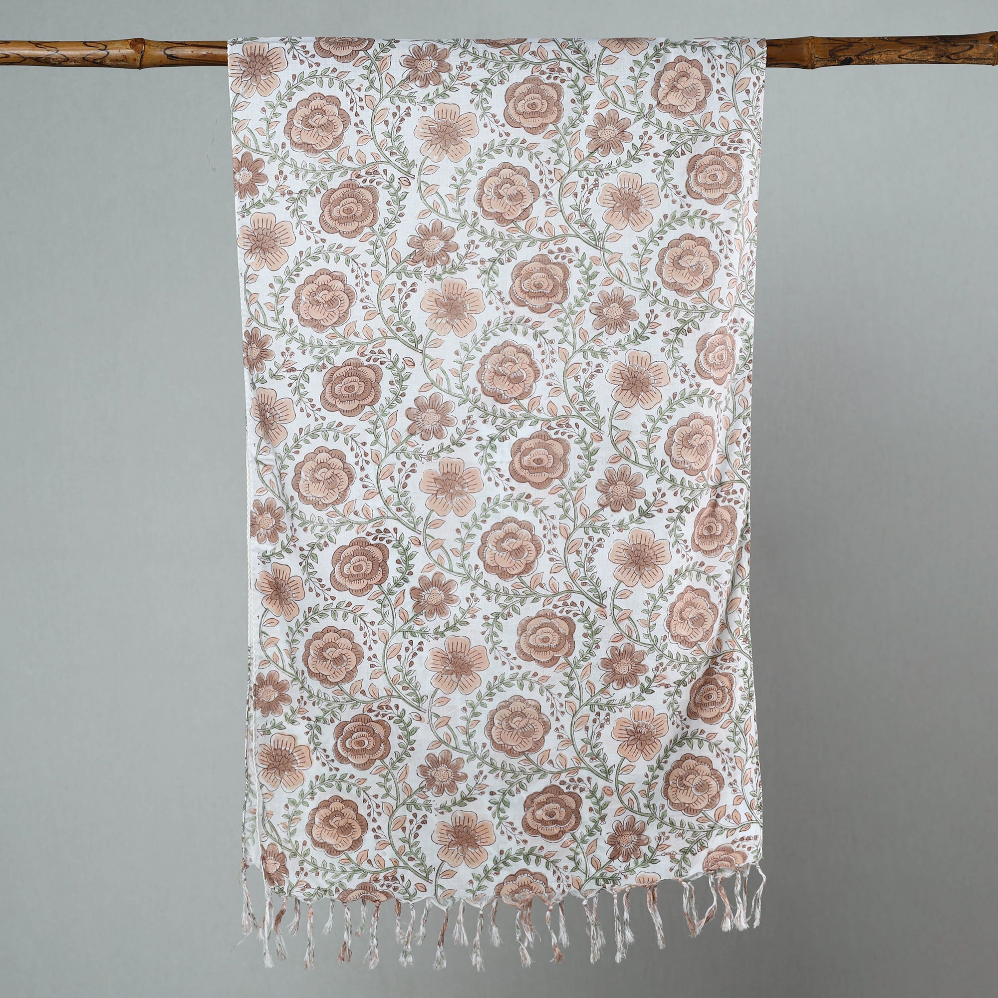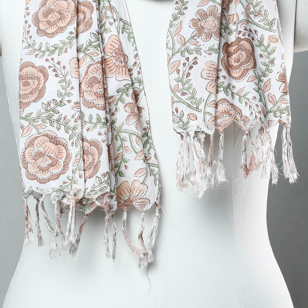 Fine quality delicate brown sanganeri block printed cotton stole with tassels. Made using VAT dyes, this stole features intricate floral patterns, also known as 'Buttas', which are exclusive to sanganeri prints. The elaborate detailing of the flowers and petals showcases the artistry of this hand-block printing technique originating from Sanganer, Rajasthan.