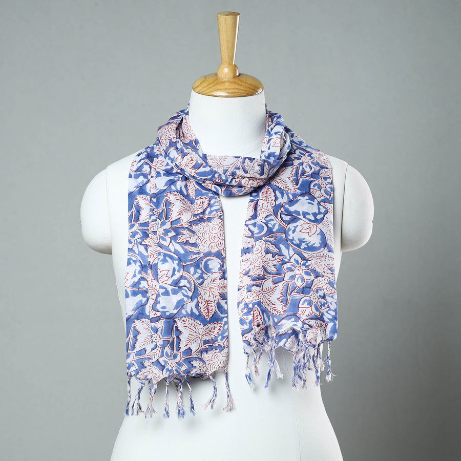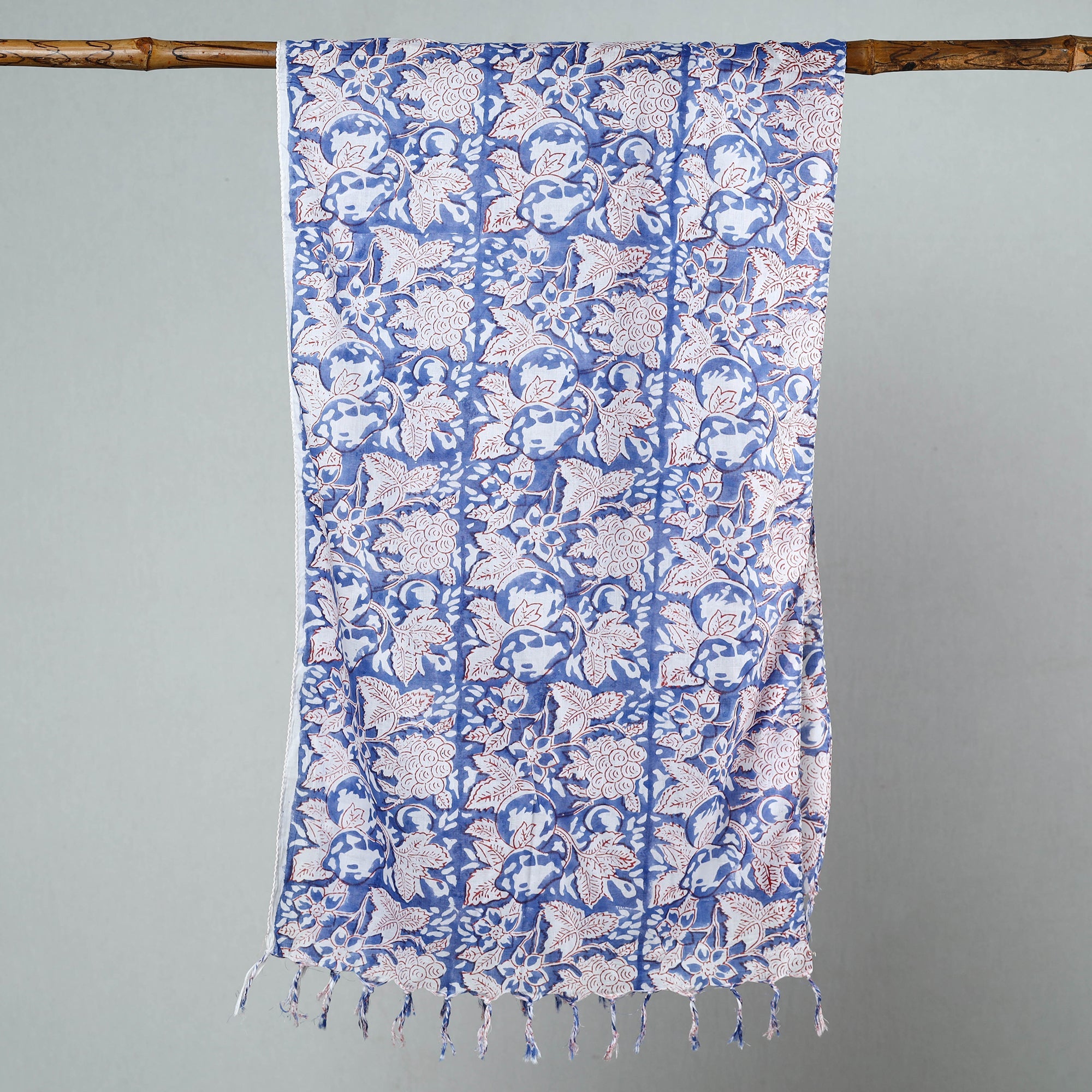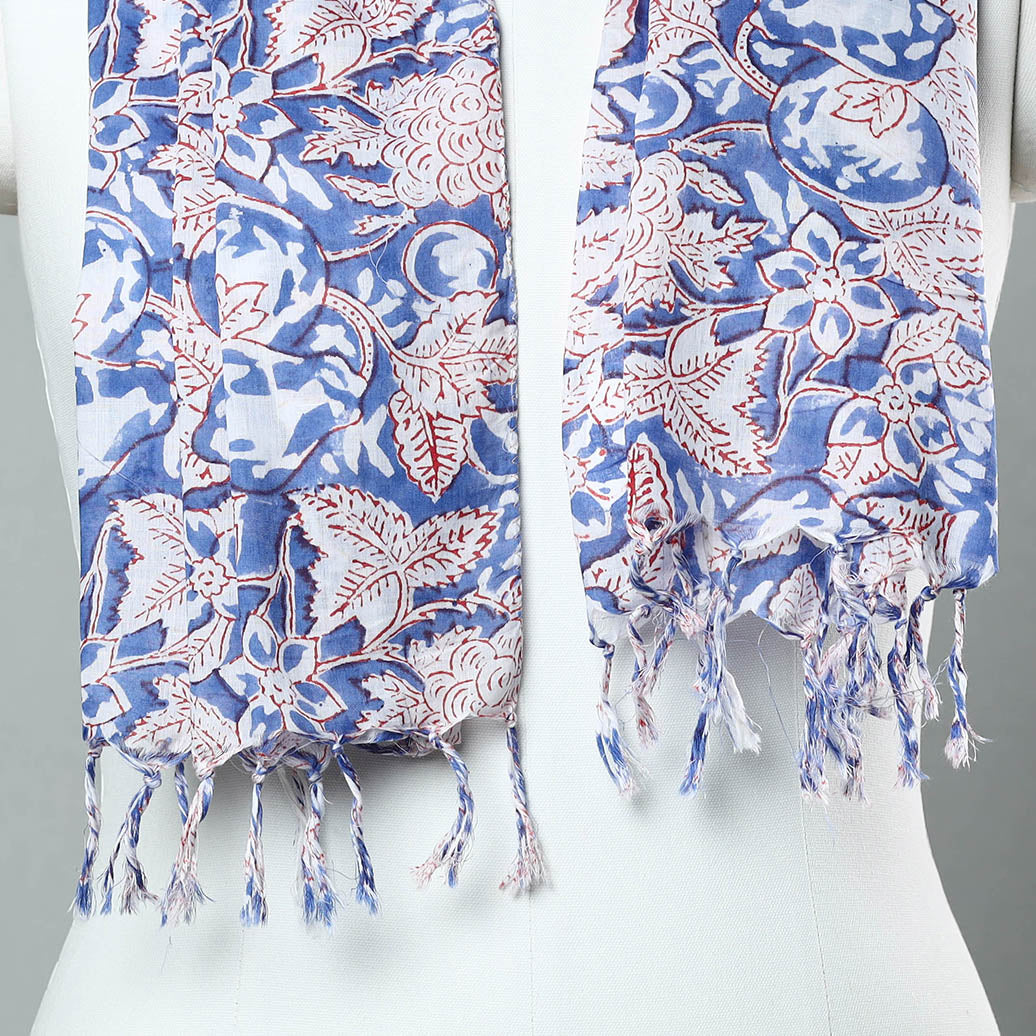 Blue - Sanganeri Block Printed Cotton Stole with Tassels 28