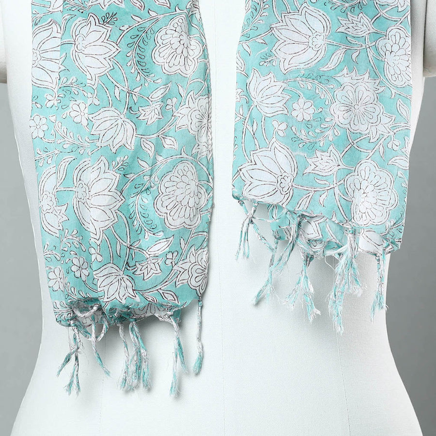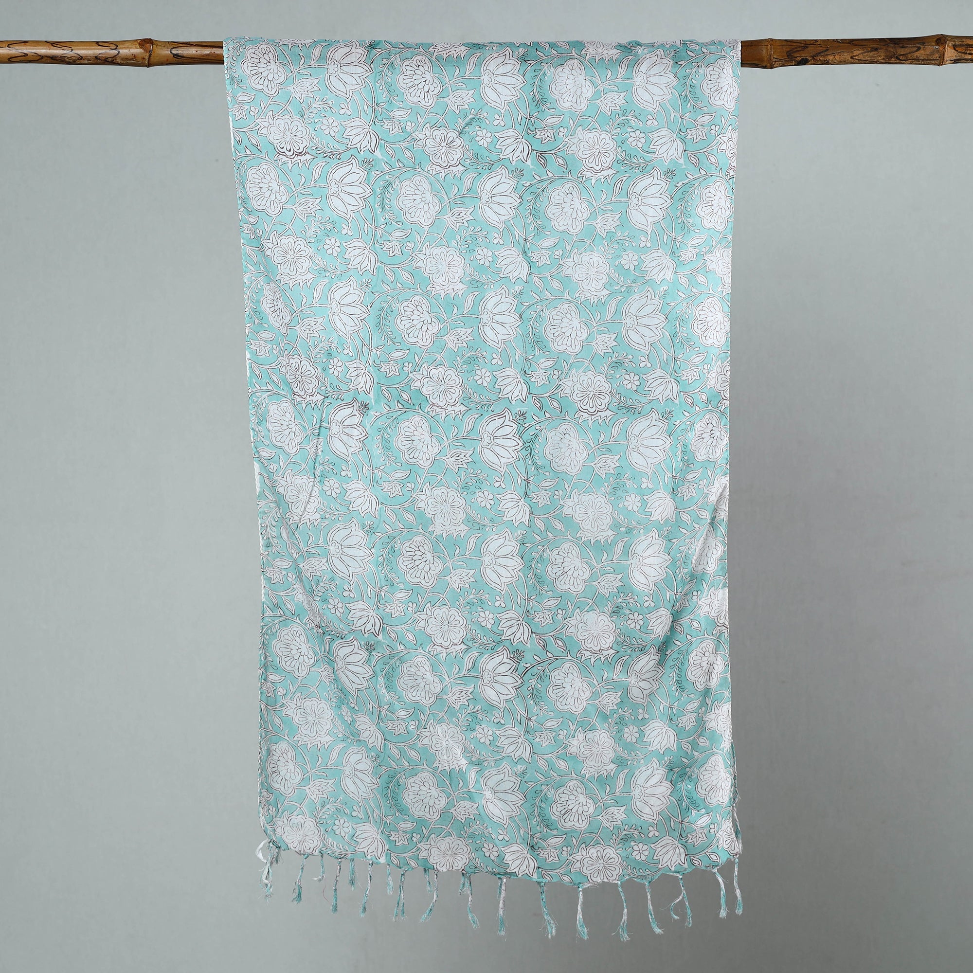 Fine quality delicate aqua blue sanganeri block printed cotton stole with tassels. Made using VAT dyes, this stole features intricate floral patterns, also known as 'Buttas', which are exclusive to sanganeri prints. The elaborate detailing of the flowers and petals showcases the artistry of this hand-block printing technique originating from Sanganer, Rajasthan.