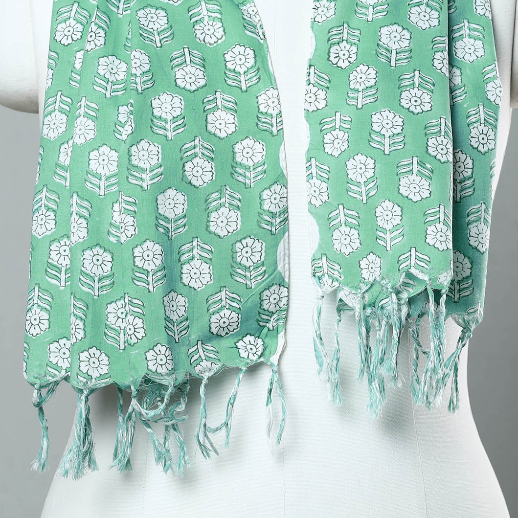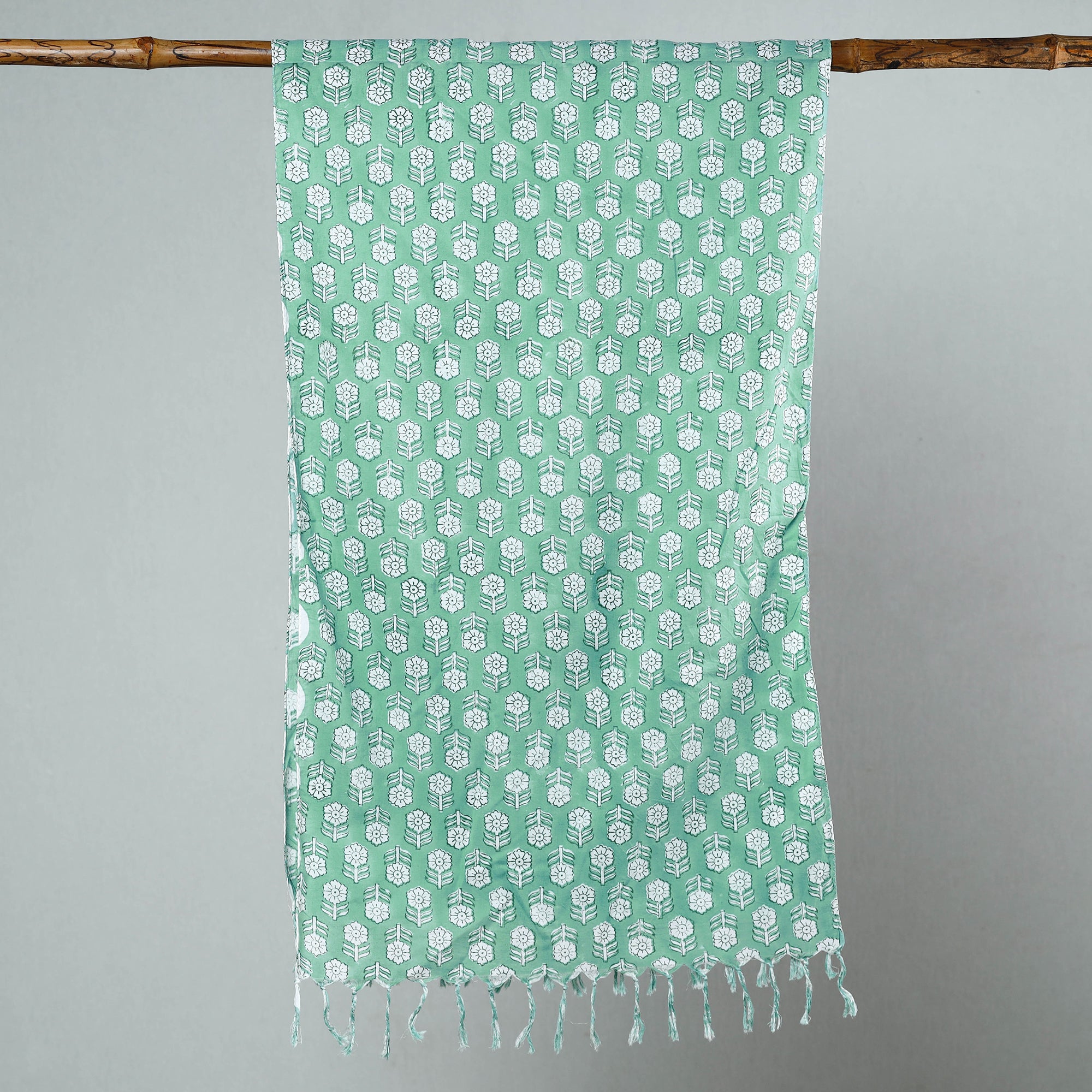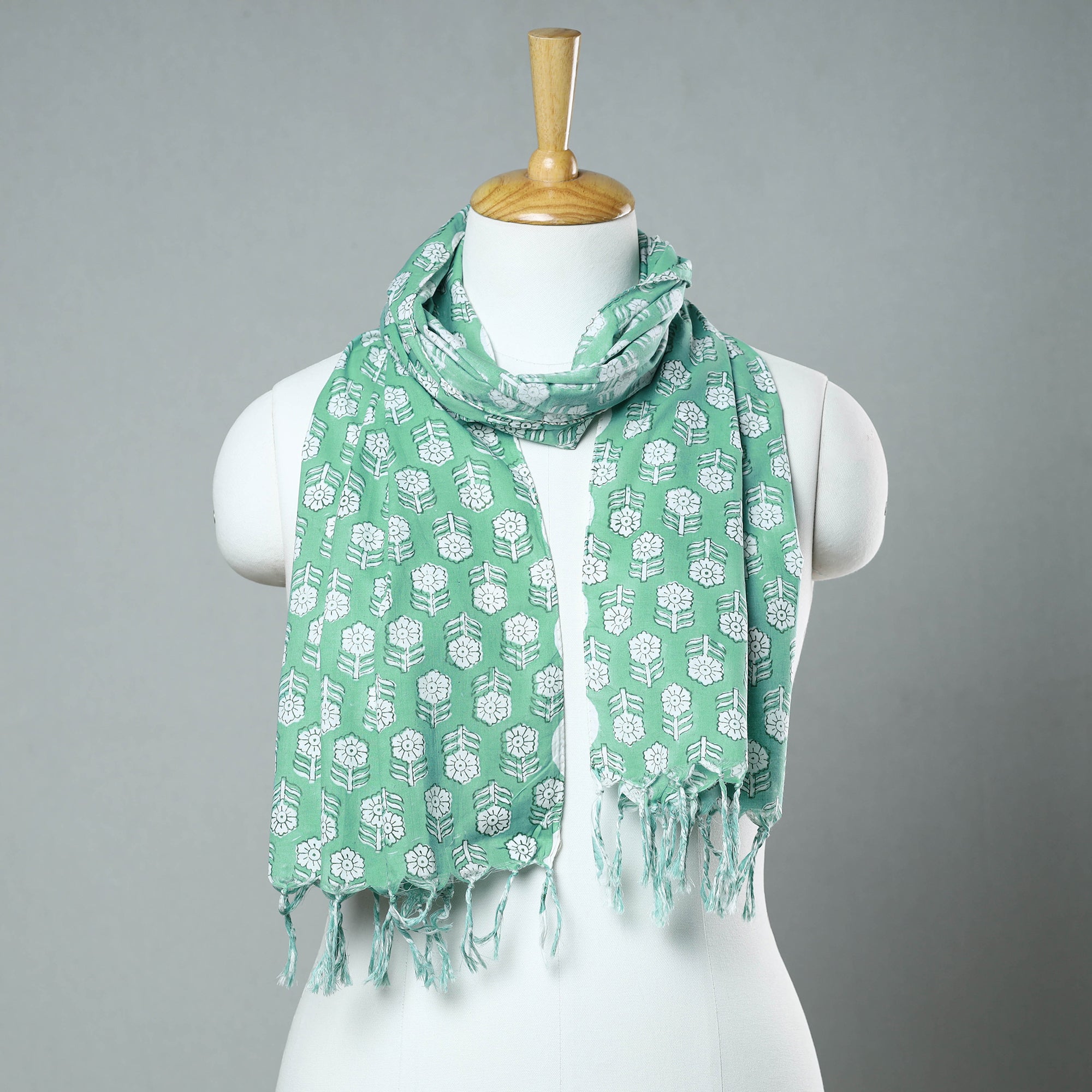 Fine quality delicate sanganeri block printed cotton stole with tassels. Made using VAT dyes, this stole features intricate floral patterns, also known as 'Buttas', which are exclusive to sanganeri prints. The elaborate detailing of the flowers and petals showcases the artistry of this hand-block printing technique originating from Sanganer, Rajasthan.