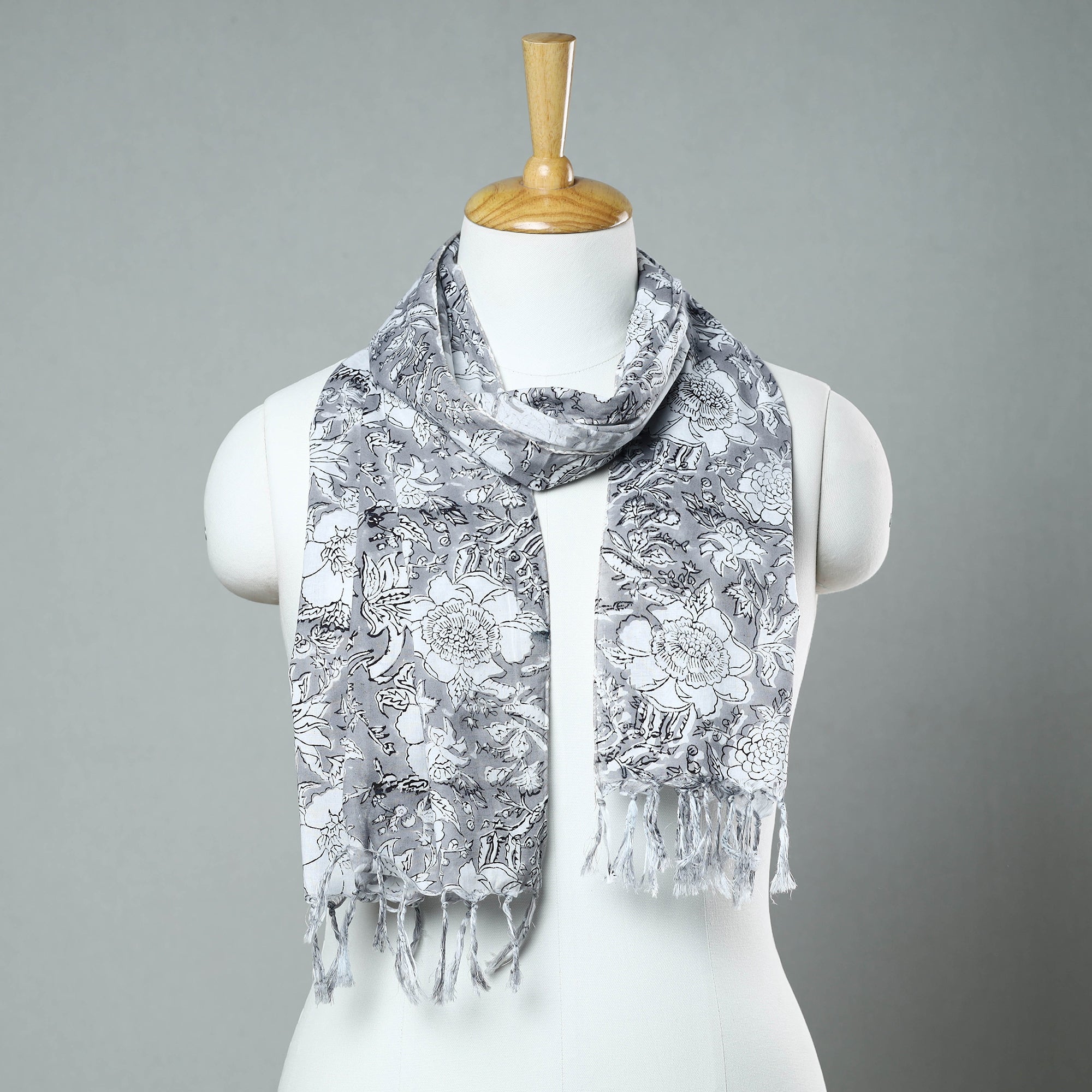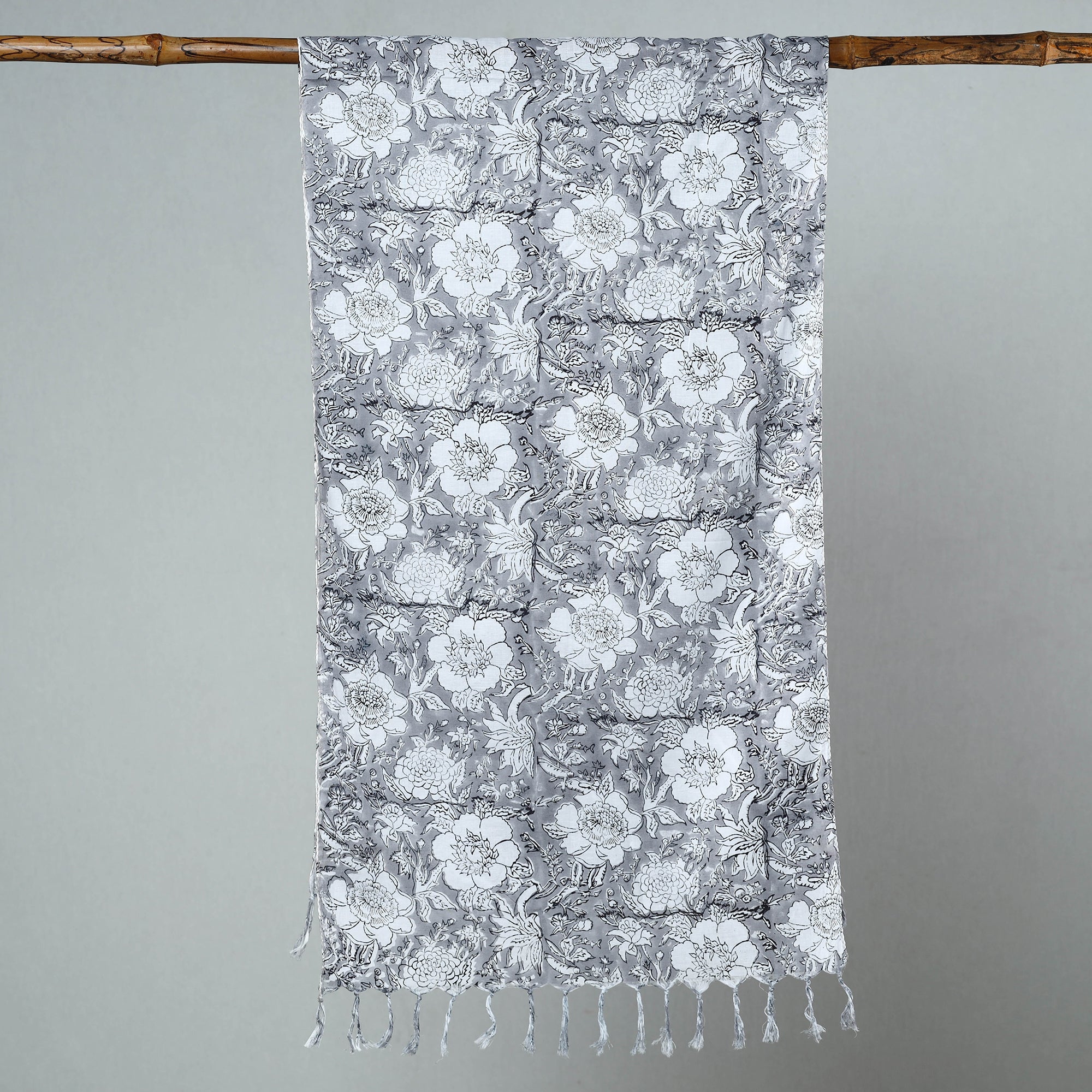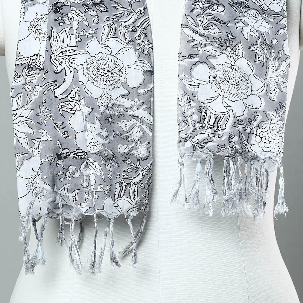 Grey - Sanganeri Block Printed Cotton Stole with Tassels 48