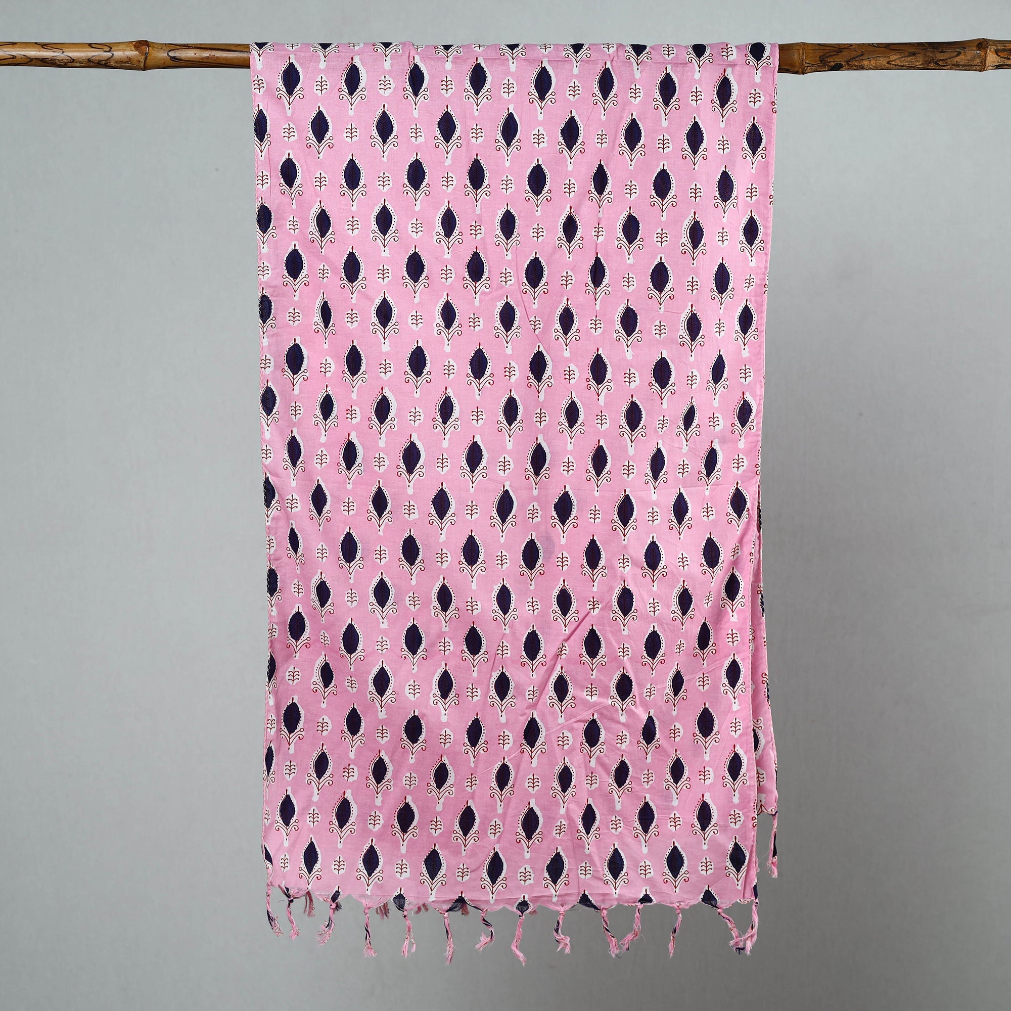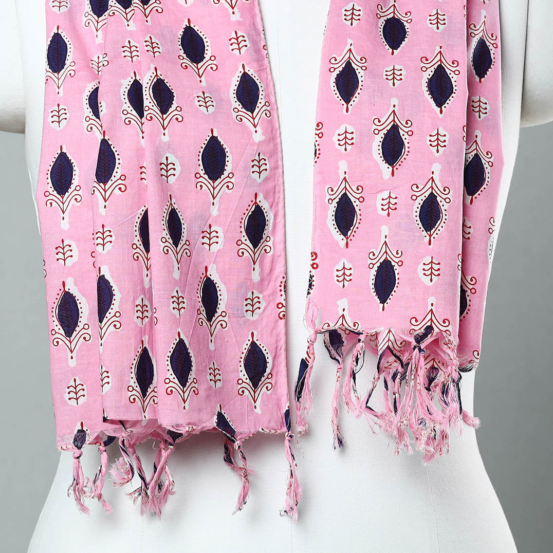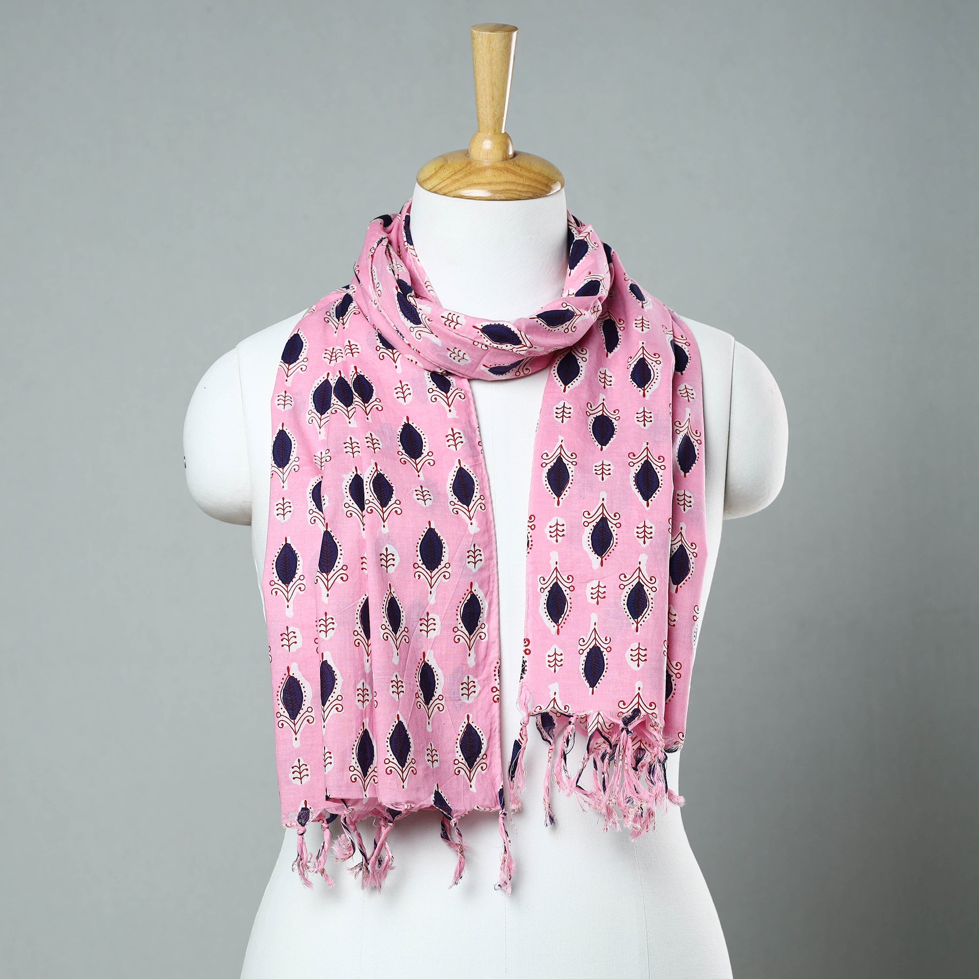 Pink - Sanganeri Block Printed Cotton Stole with Tassels 06