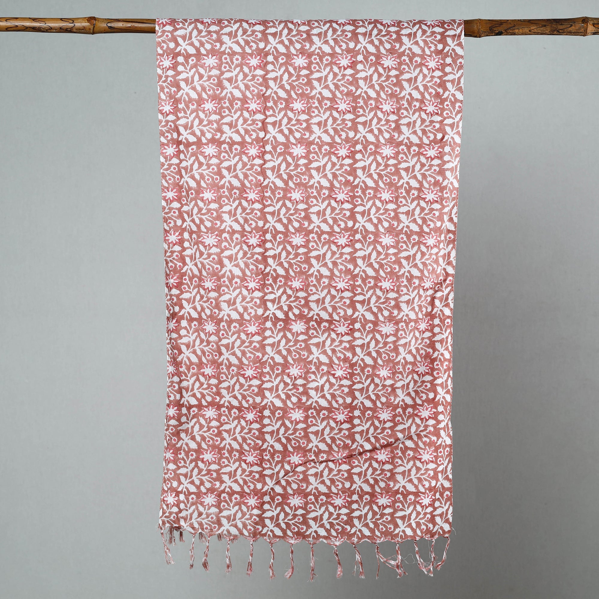 Fine quality delicate sanganeri block printed cotton stole with tassels. Made using VAT dyes, this stole features intricate floral patterns, also known as 'Buttas', which are exclusive to sanganeri prints. The elaborate detailing of the flowers and petals showcases the artistry of this hand-block printing technique originating from Sanganer, Rajasthan.